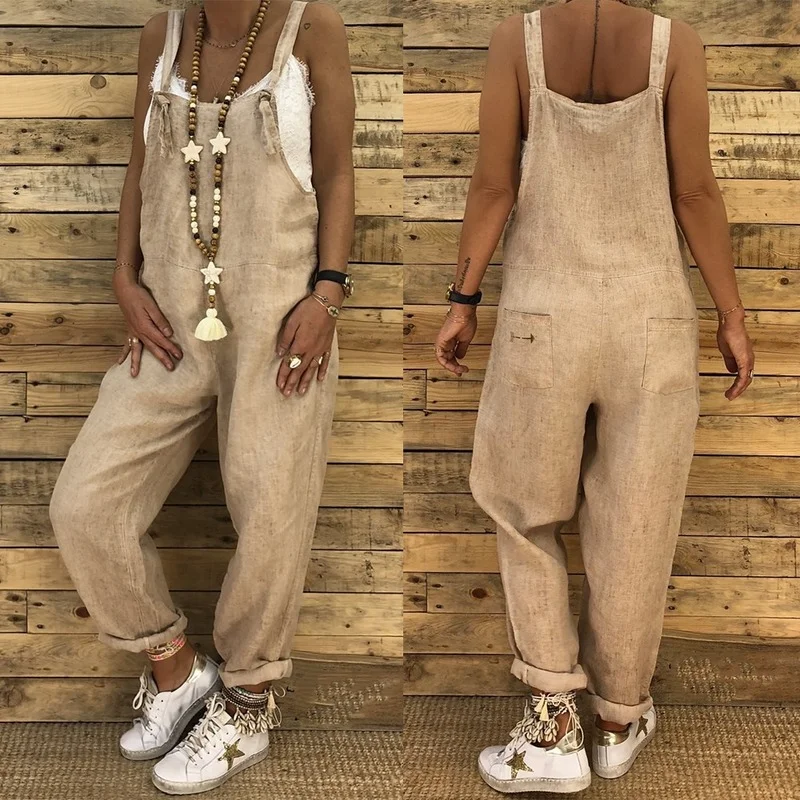 Женский льняной комбинезон, повседневный однотонный комбинезон на бретелях, без рукавов, с длинным нагрудником, лето 2021, размера плюс