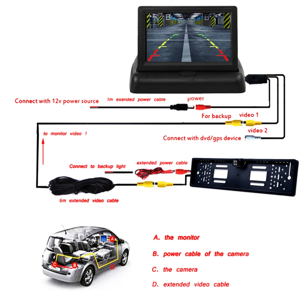 1 x камера заднего вида автомобиля1 х Кабель питания1 x видео кабельРуководство пользователя на английском языке-1 шт.1x4,3 "TFT LCD автомобильный монитор1x Кабель питания1 Руководство пользователя (монитор)