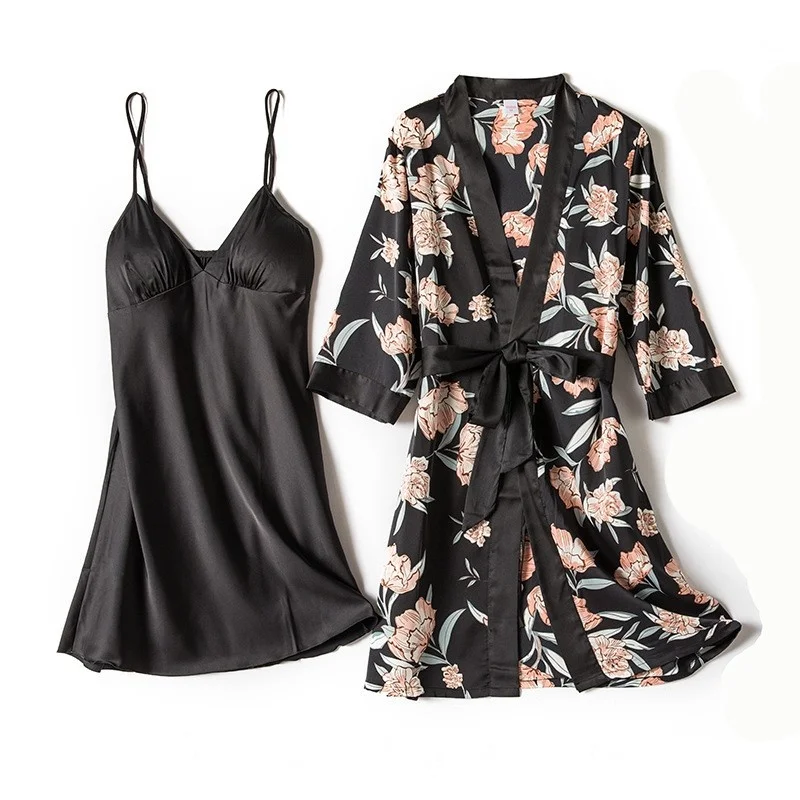 Комплект женской атласной ночной рубашки, с цветочным принтом