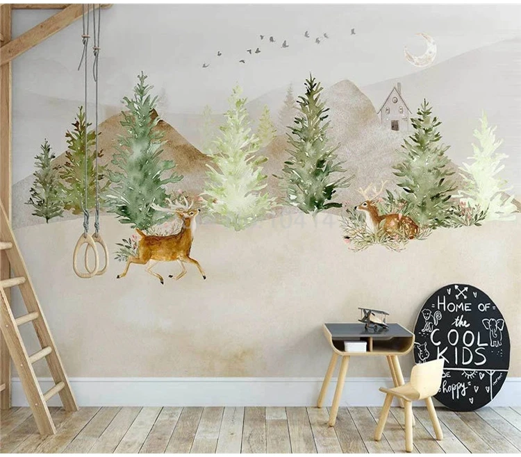 Пользовательские Настенные обои Nordic Ins ручная роспись лес Лось летающая птица Фреска детская комната фон стены Papel De Parede 3D