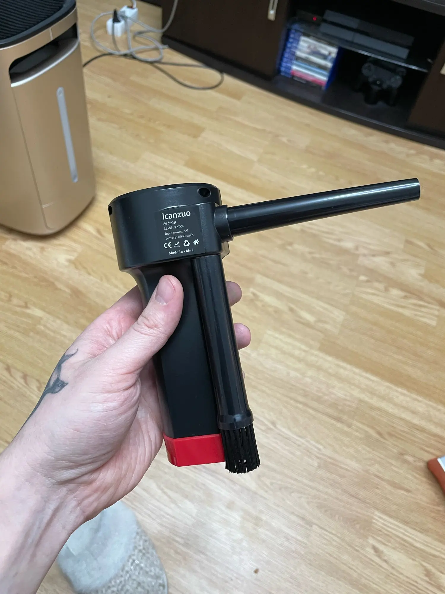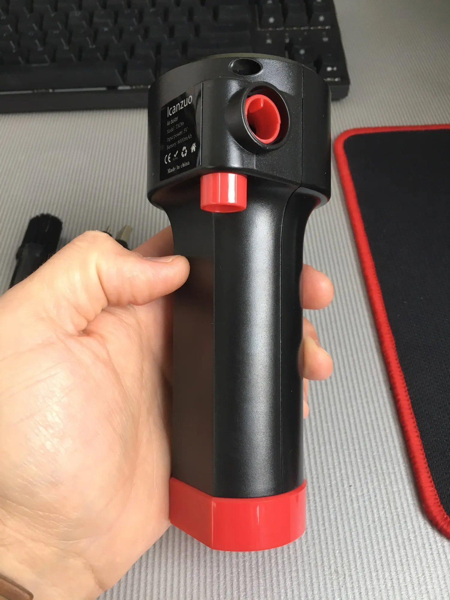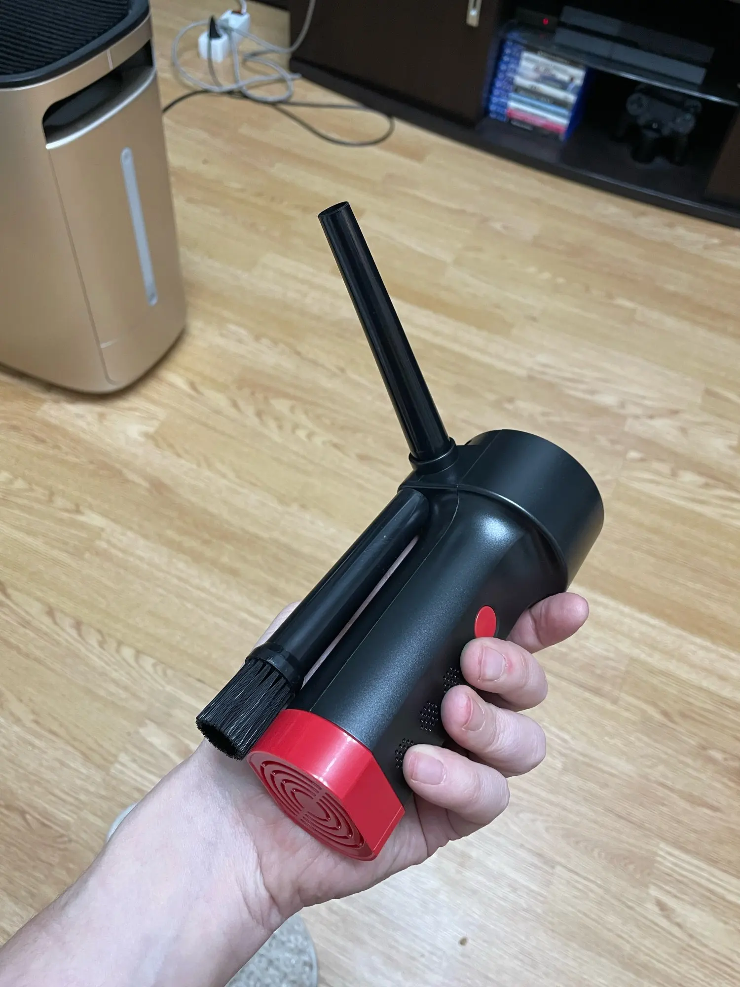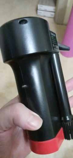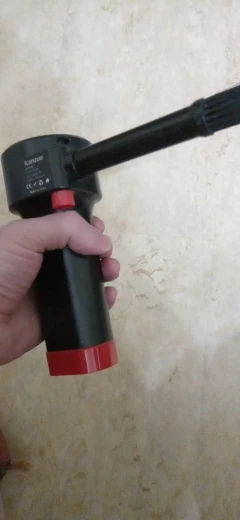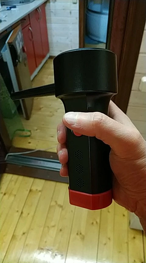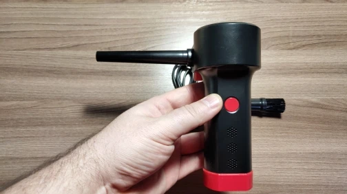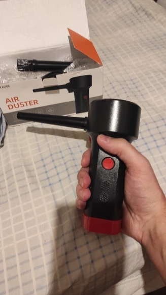 Весьма неплохое устройство, до покупки был настроен скептически, но результатом остался доволен, воздушный поток достаточно сильный. Конечно послабее сжатого воздуха, но пыль выдувает почти полностью. Пользоваться удобно, работает в любом положении, моторчик правда, очень шумный. Насадки всего две, одна со щетиной, хотелось бы с более узким конусом, но наверное будут проблемы с охлаждением.