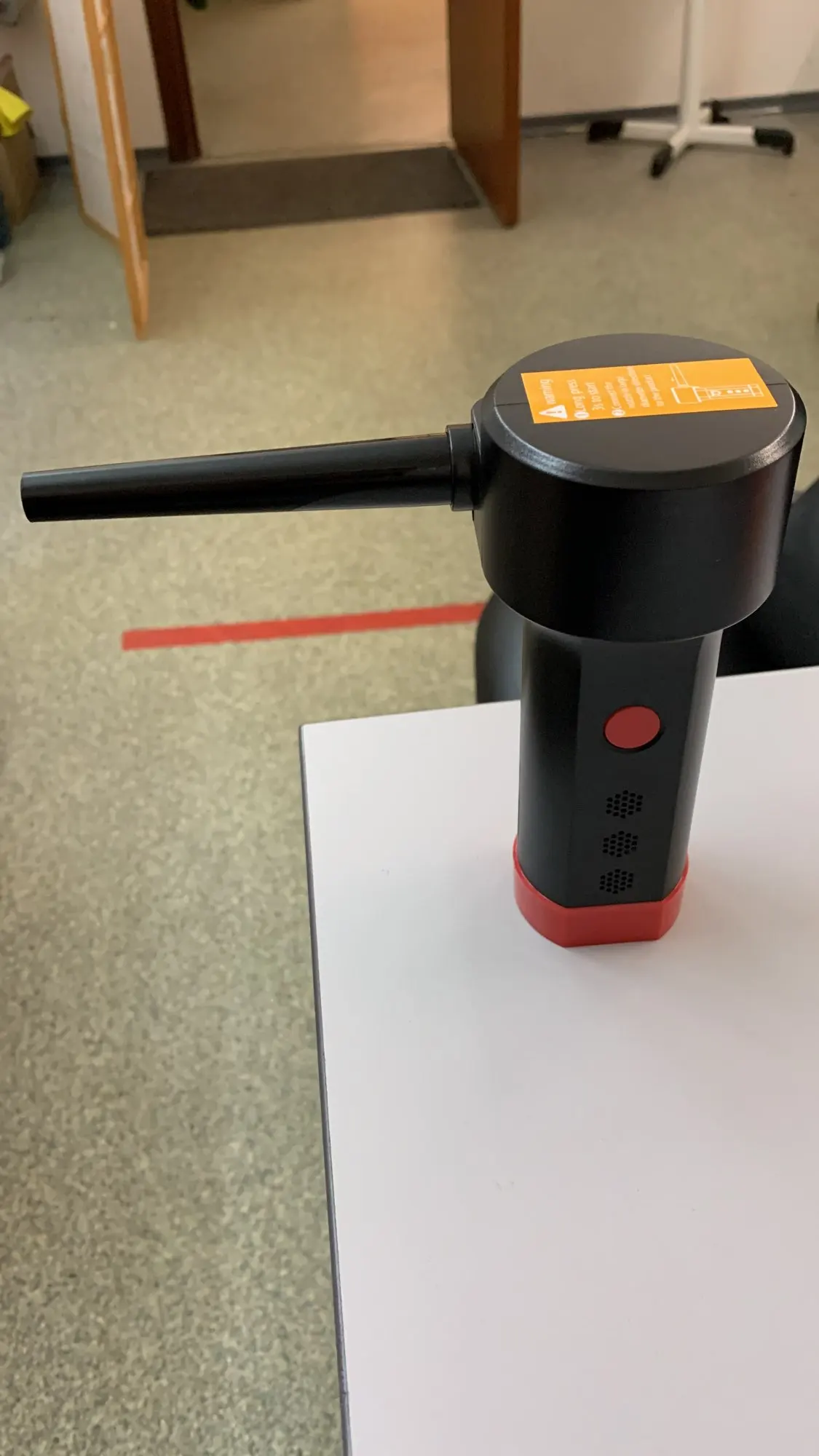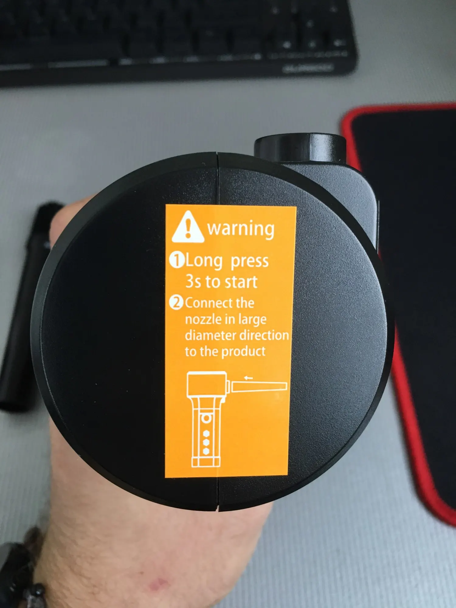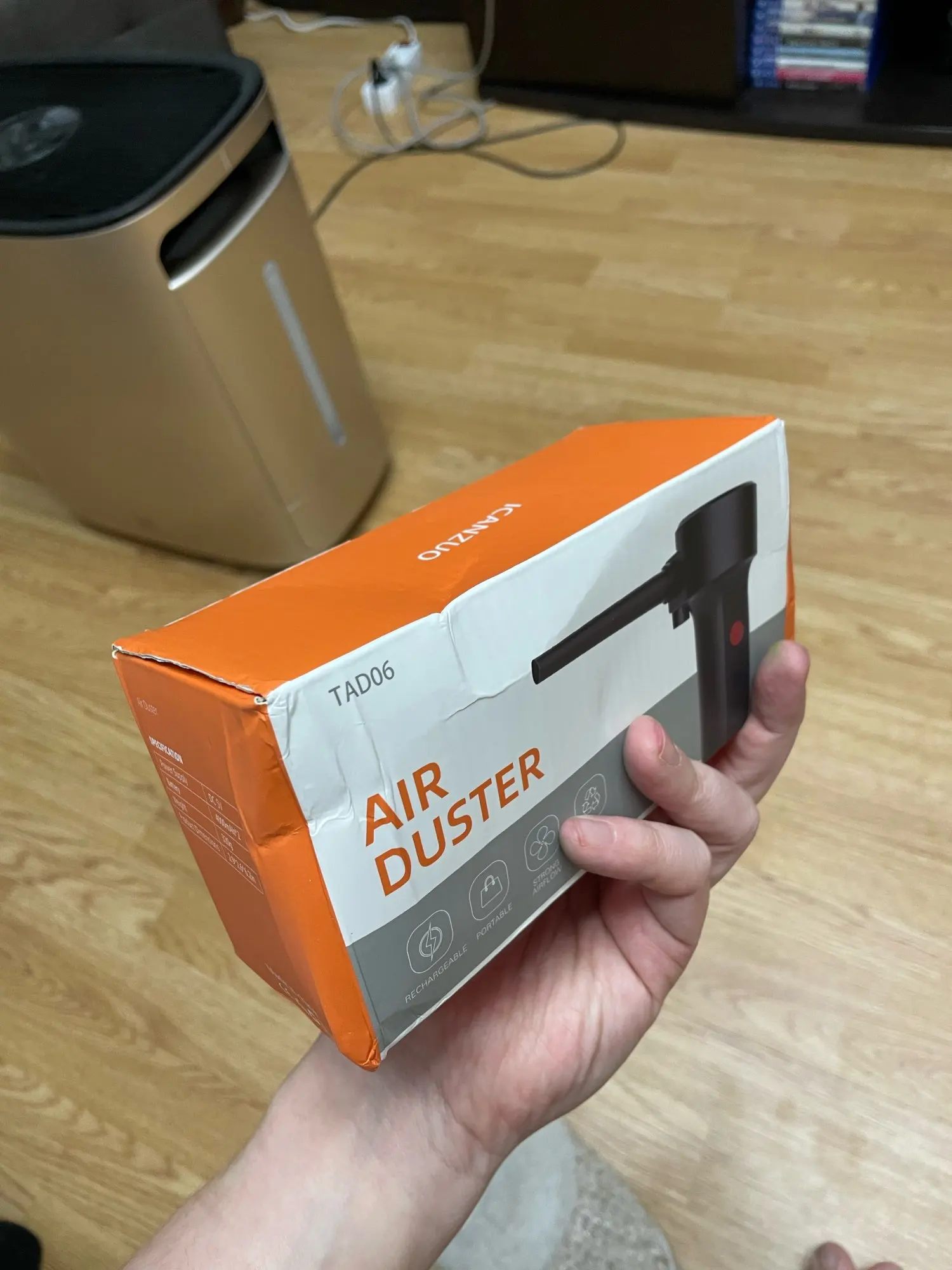 Упаковка немного помялась, главное внутри все целое. Аппарат выполнен качественно, при первом использовании чувствуется неприятный запах. В целом дует неплохо, струя конечно не как от сжатого воздуха, но для продувки компьютера и клавиатуры вполне подойдёт.