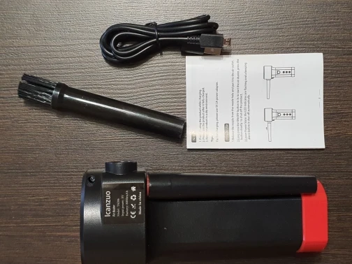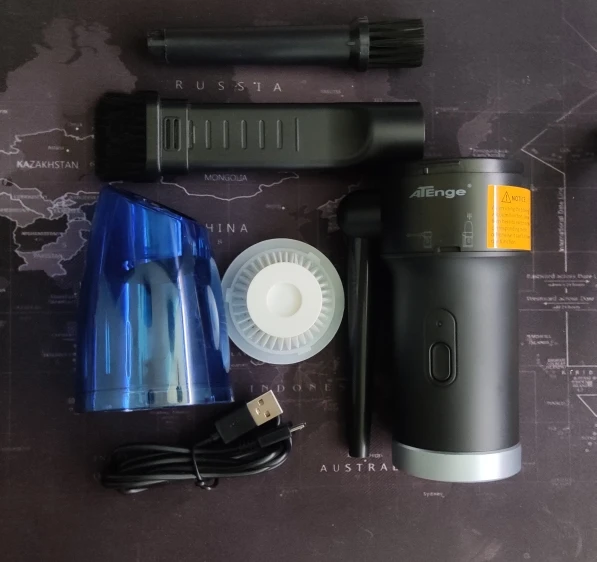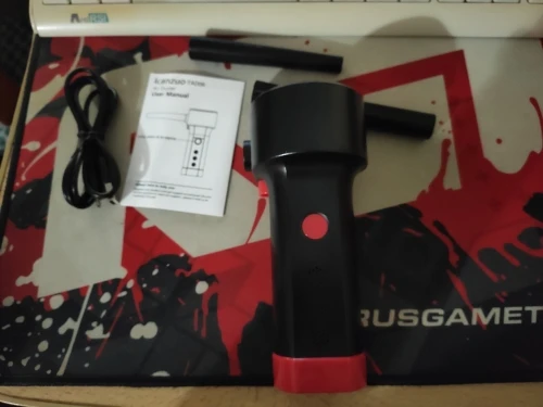 посылка пришла за три недели, коробка в обычном пакете, поэтому помялась, но внутри всё целое. в комплекте сам обдуватель, зарядный провод и две насадки - одна цилиндрическая со щеткой, другая на конус для концентрированного обдува. приехала с зарядкой батареей, не сразу попробовал - дует хорошим воздушным потоком, действительно сравнимым с баллончиками со сжатым воздухом (у них, справедливости ради, диаметр сопла в разы меньше, поэтому давление на выходе может казаться субъективно больше). штуковиной пока очень доволен, посмотрю сколько проработает.