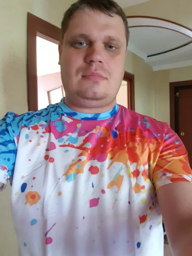 Футболка пришла другого цвета, обидно немного. Заказывала зелёную, пришла синяя. Но муж сказал, что и синяя норм. Футболка синтетическая, в дырочку. Продувается, в ней не жарко.