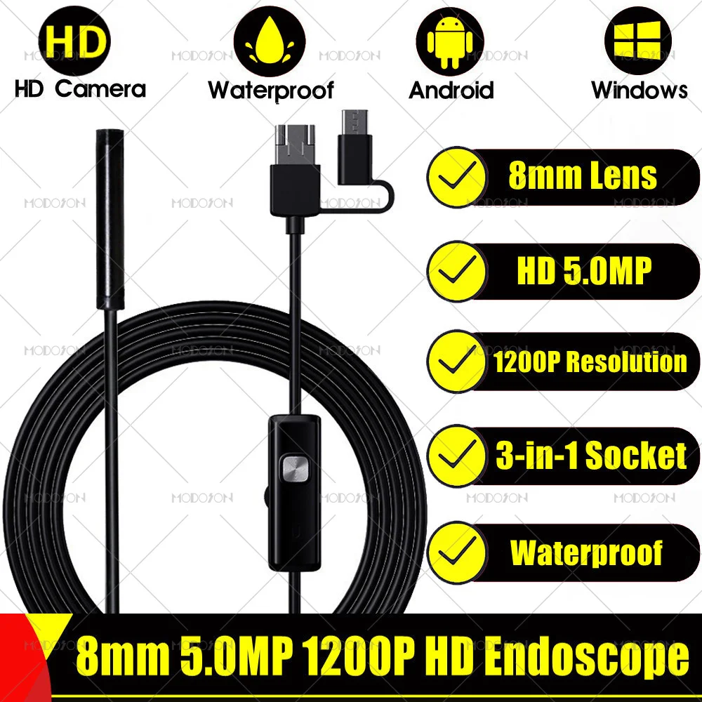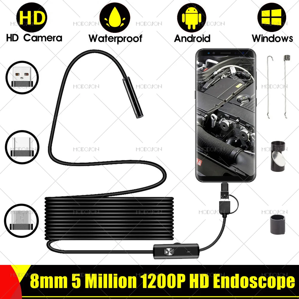 Эндоскоп с гибким кабелем, 8 мм, 5 млн. камер 1200P HD, OTG, Micro USB, Type-C, Водонепроницаемый Бороскоп для осмотра, гибкая трубка для эндоскопии