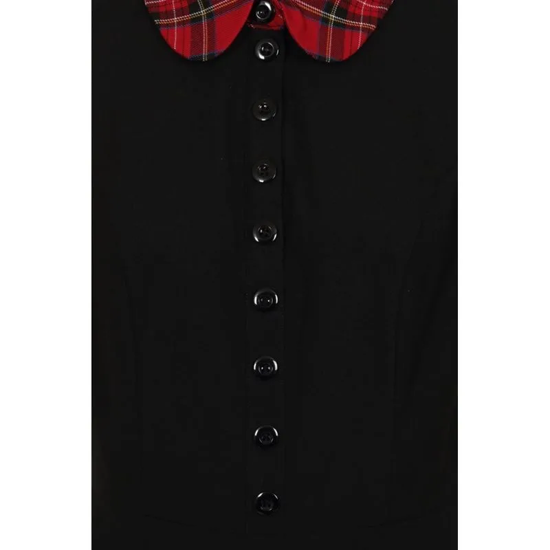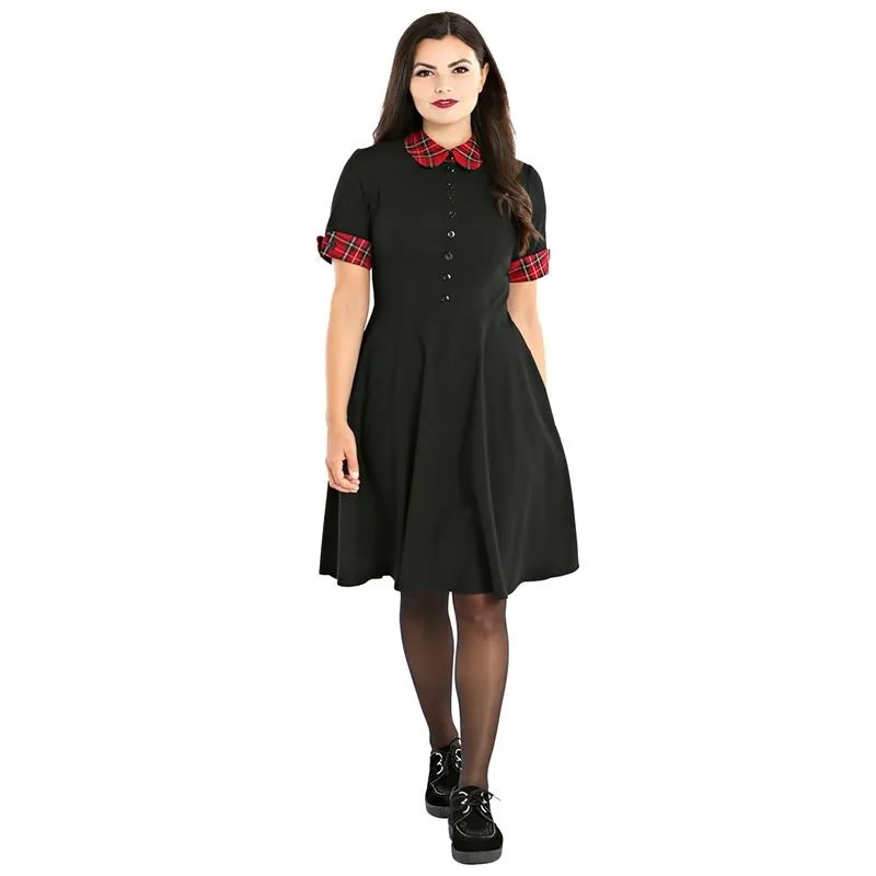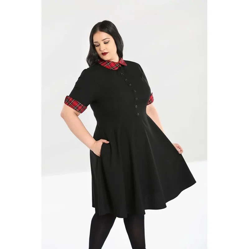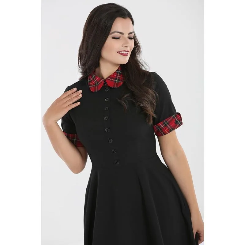 Красивое черное платье-клеш. Облегающий лиф с черными пуговицами (отстегивается на половину стороны). Красный воротник в шотландскую клетку. Короткие рукава и красные манжеты в шотландскую клетку. Шов талии. Расклешенная юбка с боковыми карманами.