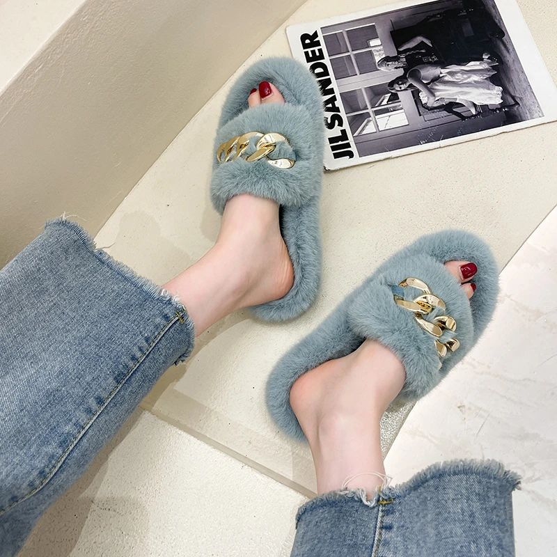 Симпатичные домашние туфли, плюшевые сланцы с металлической цепочко...