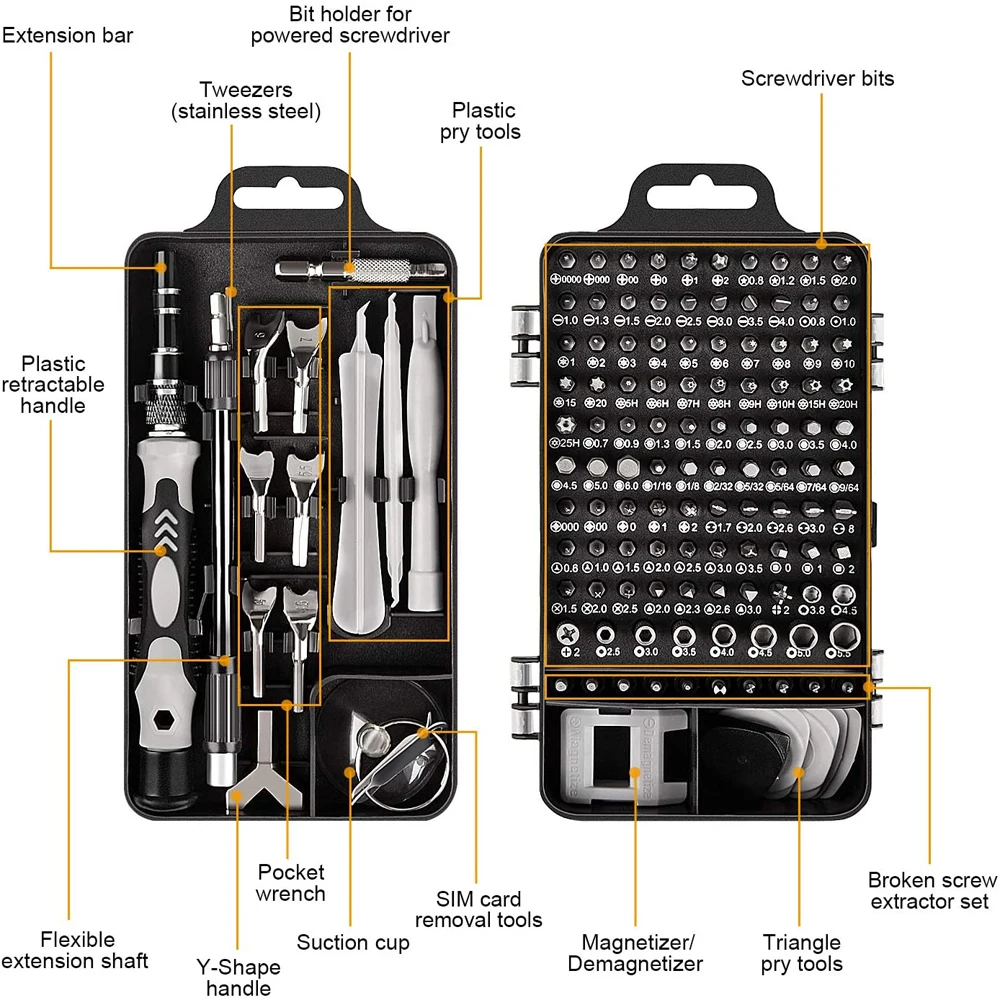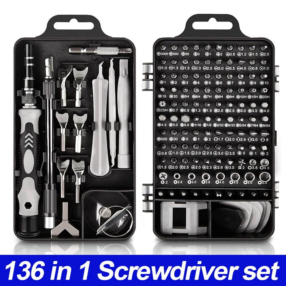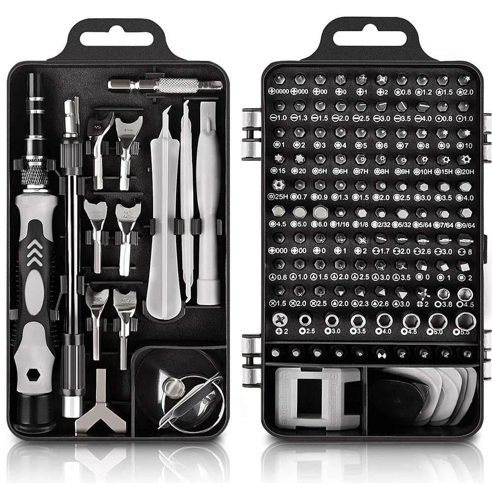 20 аксессуаров для разборки: 1 ручка (пластик) 1 x гибкий Удлинительный вал 1 x удлинитель 1 x пинцет 3x пластиковые инструменты 2 x удаление sim-карты 1 x намагничиватель/размагничиватель 1 x присоска 6 x открывающаяся палочка 1 x держатель бит для отвертка 1 x ручка y-образной формы 1 x коврик с винтовой памятью 115 шт. биты отверток: Phillips:PH0000 PH000 PH00 PH0 PH1 PH2 Щелевые: SL1.0 SL1.3 SL1.5 SL2.0 SL2.5 SL3.0 SL3.5 SL4.0 Torx: t1 T2 T3 T4 T5 T6 T7 T8 T9 T10 T15 T20 Torx с отверстием: T5H T6H T7H T8H T9H T10H T15H T20H T25H Pentagonal: p2 【☆ 0,8 】 P5 【☆ 1,2 】 P6 【☆ 1,5 】 P8 【☆ 2,0 】 Шестигранная: H0.7 H0.9 H1.3 H1.5 H2.0 H2.5 H3.0 H3.5 H4.0 H4.5 H5 H6 Шестигранная: H1/16 H1/8 H2/32 H5/32 H5/64 H7/64 H9/64 POZI: PZ000 PZ00 PZ0 PZ1 PZ2 три точки: Y0.6 Y1.0 Y1.5 Y2.0 Y2.5 Y3.0 Y3.5 треугольник: △ 2,0 2,3 2,3 2,6 2,6 U 3,0 u-форма: U1.7 U2.0 U2.6 U3.0 U8 MID:W1.5 W2.0 W2.5 квадрат: S0 S1 S2 IC Разъем: PH2 SIM: 0,8 1,0 ICS: IN PH2 4 мм разъем: M2.5 M3.0 M3.5 M4.0 M4.5 M5.0 M5.5 G3.8 G4.5 кран: ex6 Ex7 Ex8 Ex9 Ex10 Dr6 Dr7 Dr8 Dr9 Dr10 Magnectic пикап бит: U5.0 Карманный ключ: 4 #4,5 #5 #5,5 #6 # 7 #