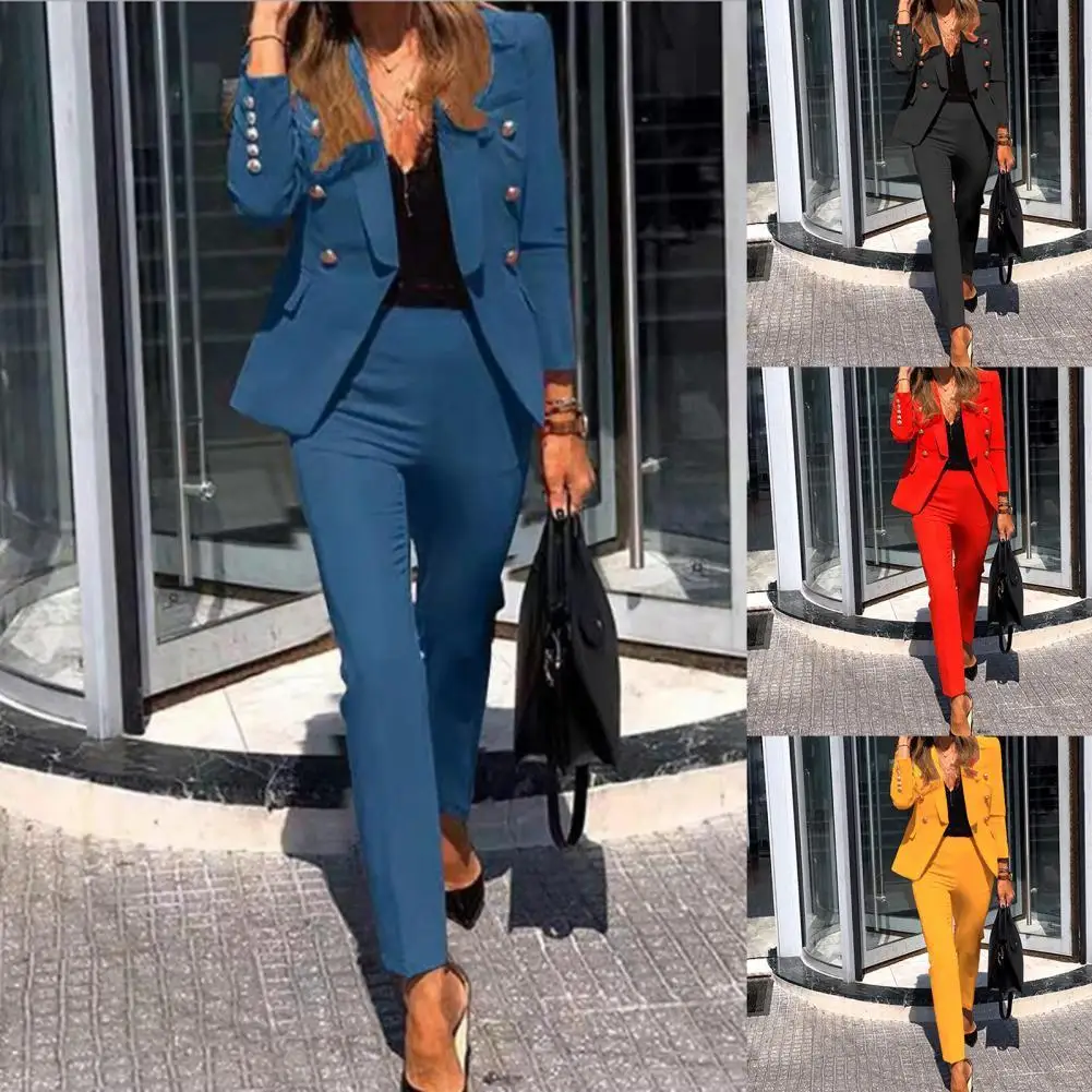 Женский брючный костюм, 2 шт.компл., однотонный костюм из двух предметов, блейзер на пуговицах с длинными рукавами и лацканами, брюки-карандаш