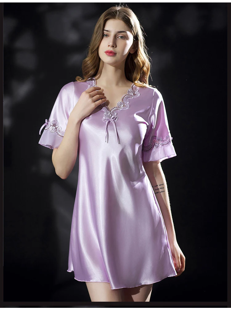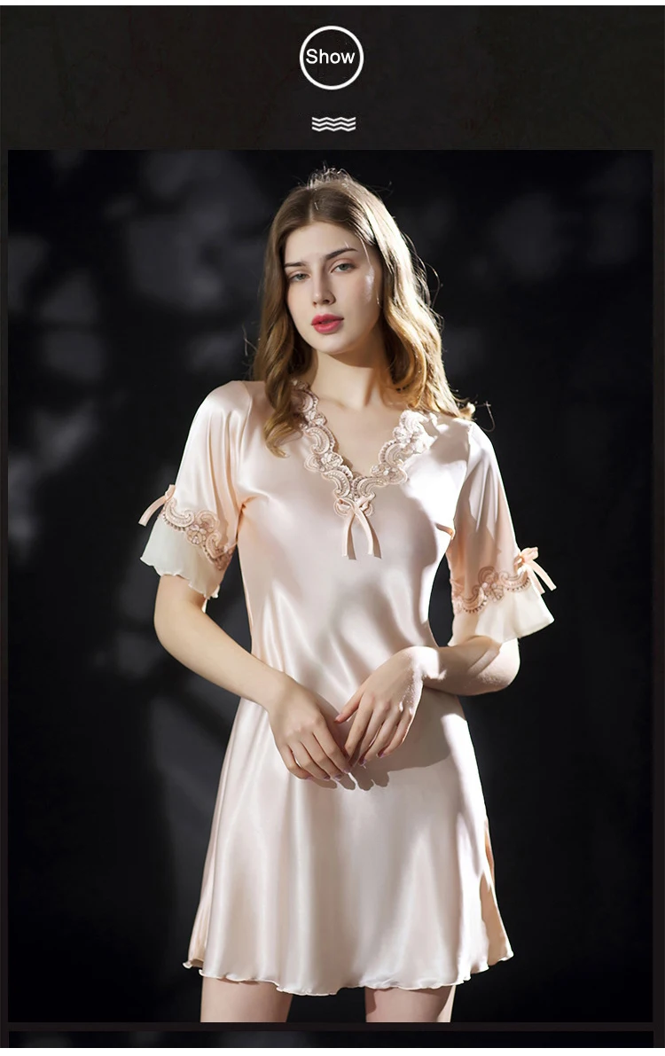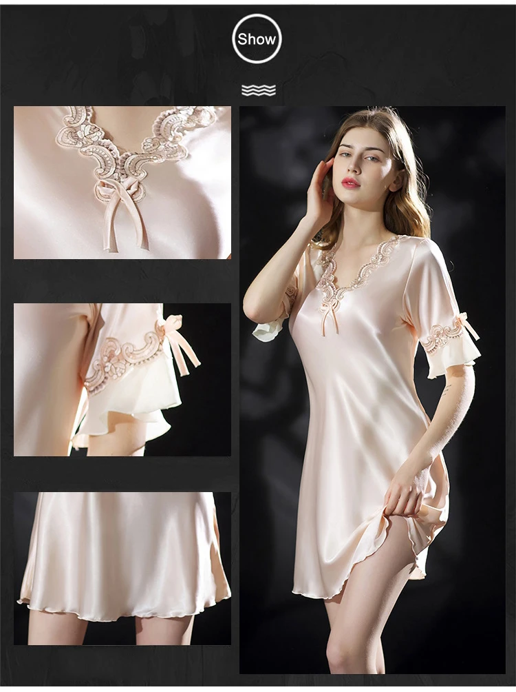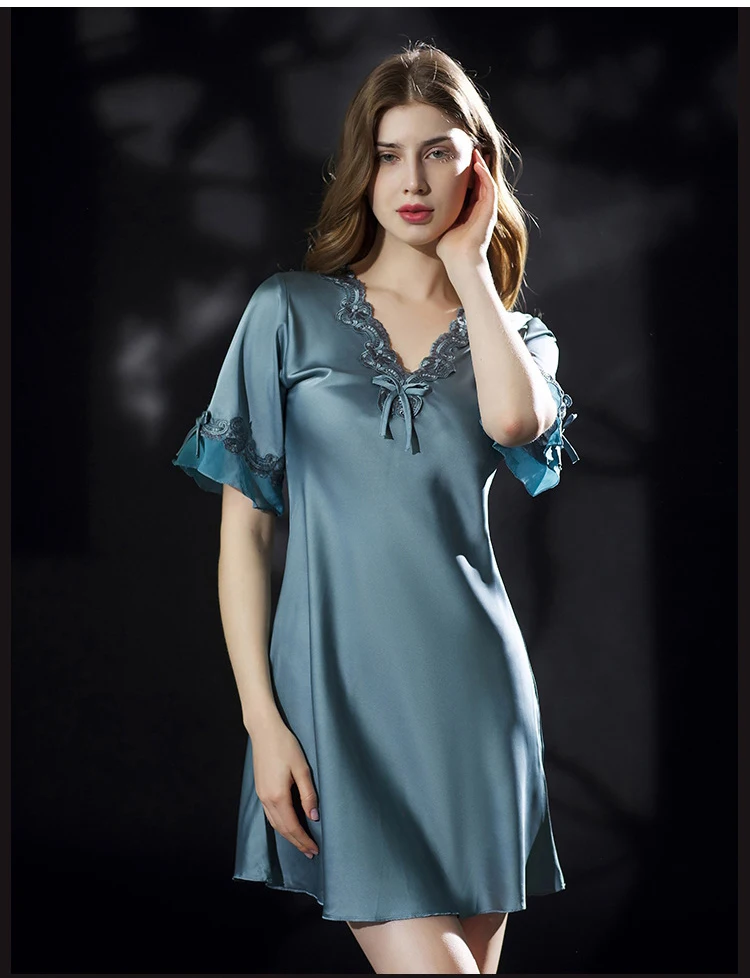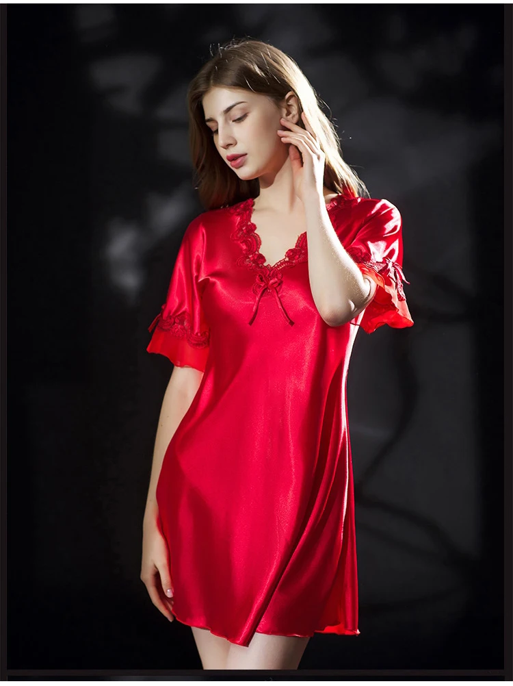 Женское ночное платье однотонная жилетка с v-образным вырезом с коротким рукавом Summerm Ice Silk Дамы Мини Ночная сорочка кружевные Сатиновые платья размера плюс ночные рубашки для женщин 2021