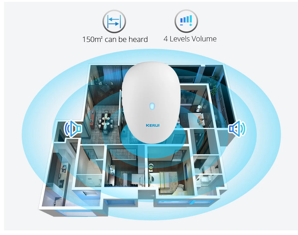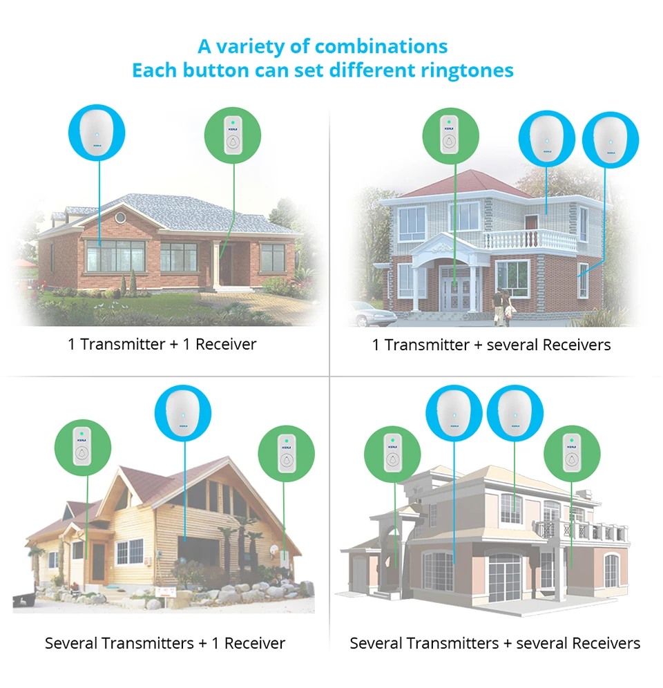 Каждый беспроводной дверной звонок может быть сопряжен с до 20 магнитными датчиками дверной сигнализации, и каждый датчик может добавить неограниченное количество приемников. Не только дверной звонок, но также может использоваться в качестве греческой сигнализации.