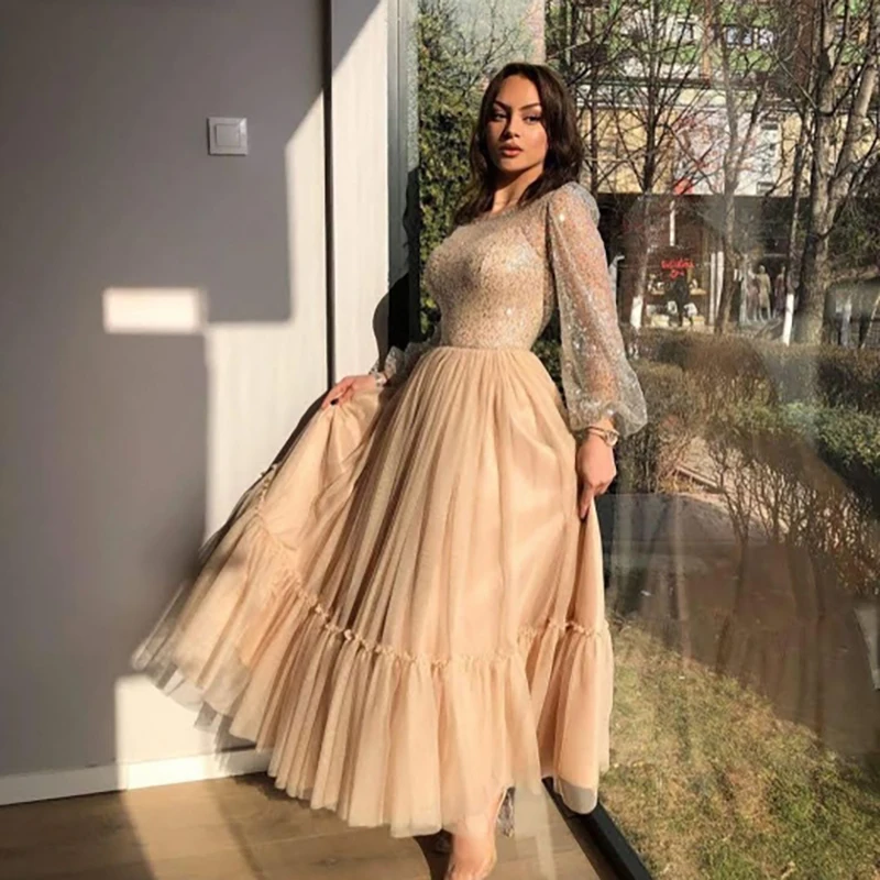 Женские платья для выпускного вечера, длинные мусульманские платья трапециевидного силуэта, с кружевными аппликациями, цвета шампанского, с длинными рукавами