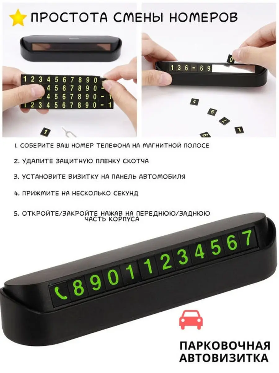 Автовизитка- отличный вариант для временной парковки. Магнитная панель позволяет легко составить ваш номер телефона из шести комбинаций от 0 до 9. Авто визитка позволяет открыть и закрыть номер телефона одним нажатием, ваш личный телефон увидят, когда Вы сами захотите это. Цифры светятся в темноте за счет люминесцентного покрытия и позволяют увидеть номер телефона водителя при необходимом случае.