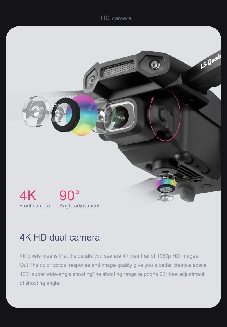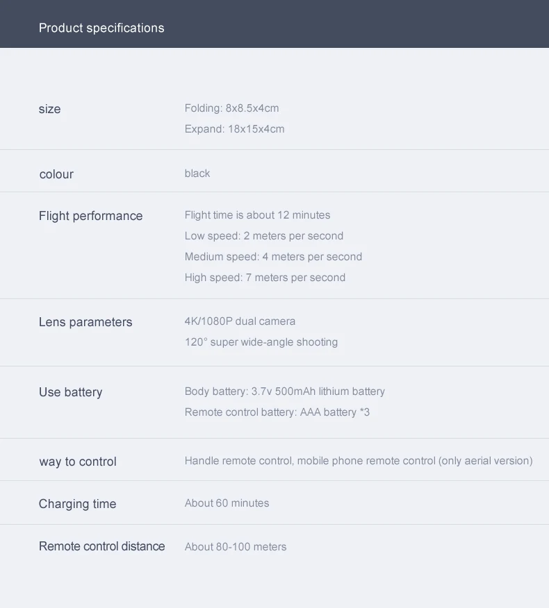 Описание:Название бренда: LSRCНомер товара. : LS-XT6Материал: АБС-пластик и электронные компонентыЦвет: черныйГироскоп: 6-axisЧастота: 2,4GКанал: 4CHДвигатель: 716 щеточный Бескаркасный двигательБатарея: 3,7 V 500MAH литий-полимерный Батарея (все указанные аккумуляторы входят в комплект поставки)Мощность передатчика: 3 аккумулятора AAA (не входят в комплект)Режим передатчика: режим 2 (левая дроссельная заслонка)Время полета: около 12 минутНизкая скорость полета: 2 м/сСредняя скорость полета: 4 м/сВысокая скорость полета: 7 м/сВремя зарядки: 60 минутДистанция RC: 80-100 мРасстояние FPV: 15-30 мFPV: WiFiКамера: 1080P-5. Камера MP, камера 4K, двойная камера 4K/1080P (опционально)Разрешение: 500 Вт-1080P, 4KУгол камеры: регулируемый 180 °- 90 °Размер квадрокоптера: 18*15*4 см (в разложенном виде)8*5,5*4 см (в сложенном виде)Вес посылка: 280 гРазмер посылка (сумка для хранения): 21,5х11х7 смОсобенности:-Складные руки, маленький размер всего 8 см, легко носить с собой.-С функцией режима удержания высоты, полет стабильный.-В безголовом режиме нет необходимости регулировать положение самолета перед полетом.-Одно нажатие: Взлет/посадка/возврат. Легко найти свой путь домой с помощью функции задней панели с одной кнопкой.-Встроенная камера HD 500W pixel /4K pixel. Удивительно, но он может снимать Потрясающие фотографии и видео с неба.-Переключатель двойной камеры, избавьтесь от фиксированного угла обзора.-С функцией Wi-Fi, он может быть подключен к приложениям, системе APK, и делать фотографии, видео и передачу в реальном времени через мобильный телефон изображения камеры.-Нарисуйте траекторию полета на экране, Дрон будет летать автономно по указанному пути.-VR 3D опыт. Через мобильное приложение с очками VR вы можете почувствовать пустоту с точки зрения.-Производство мВ, музыкальное дополнение.-3,7 V 500 мА/ч, модульная батарея, просты в установке и взять, время работы от аккумулятора до 12 минут.-2,4 ГГц технологии анти-помех.-4 канала для подъема, спуска, вперед, назад, левого полета, правого полета и 360 ° рулона.-Шестиосевой гироскоп, плавный полет и более удобное управление.-Светодиодный светильник делает полет более эффектным, особенно в темноте.Функции: вверх/вниз, вперед/назад, влево/вправо, боковой F светильник, светодиодный светильник, Безголовый режим, автоматическая кнопка возврата, режим удержания высоты, Поворот на 360 °, wiFi FPVПосылка включает в себя:1 LS-XT6 Дрон1 пульт дистанционного управления1x3,7 V 500 мА/ч, Батарея1 х USB кабель для зарядки2 запасных лезвия4 x защитный чехол1 x держатель для телефона1 отвертка1 х Руководство1 х сумка для хранения
