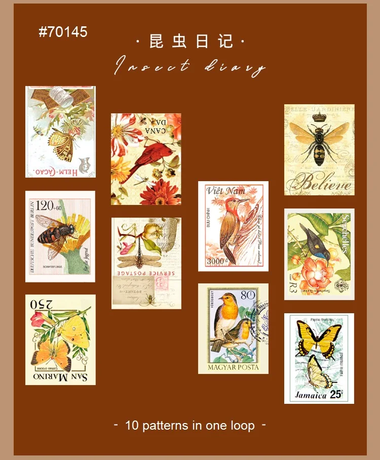 Винтажный штамп с насекомыми, грибами, Васи, бумажная наклейка для ...