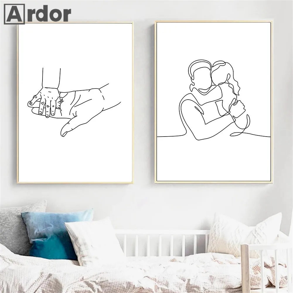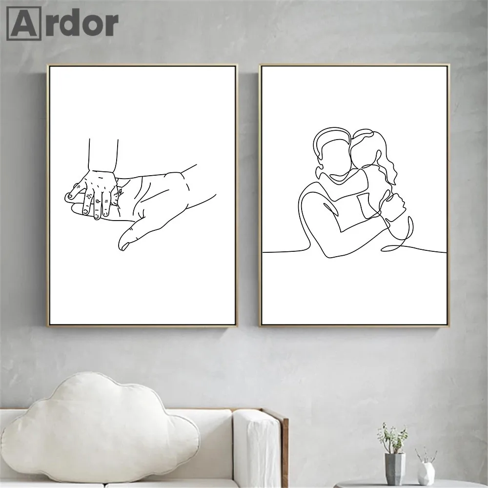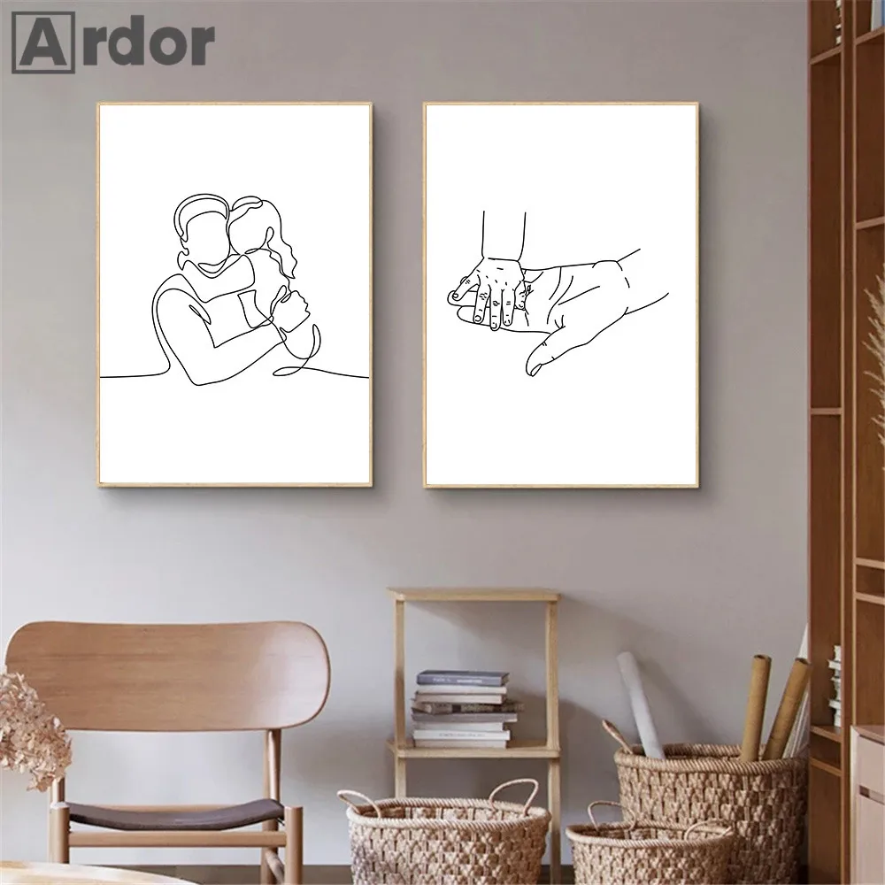 Папа дочь семейный рисунок линий постеры абстрактный малыш ручная н...