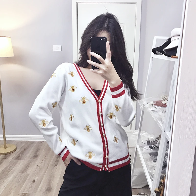 Женский однобортный Кардиган на пуговицах, трикотажный однобортный Кардиган контрастных цветов с вышивкой пчелы, жемчужинами и V-образным вырезом, длинными рукавами