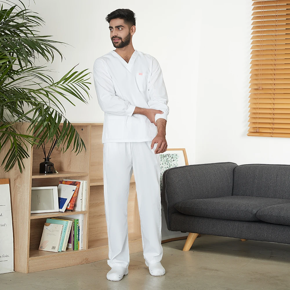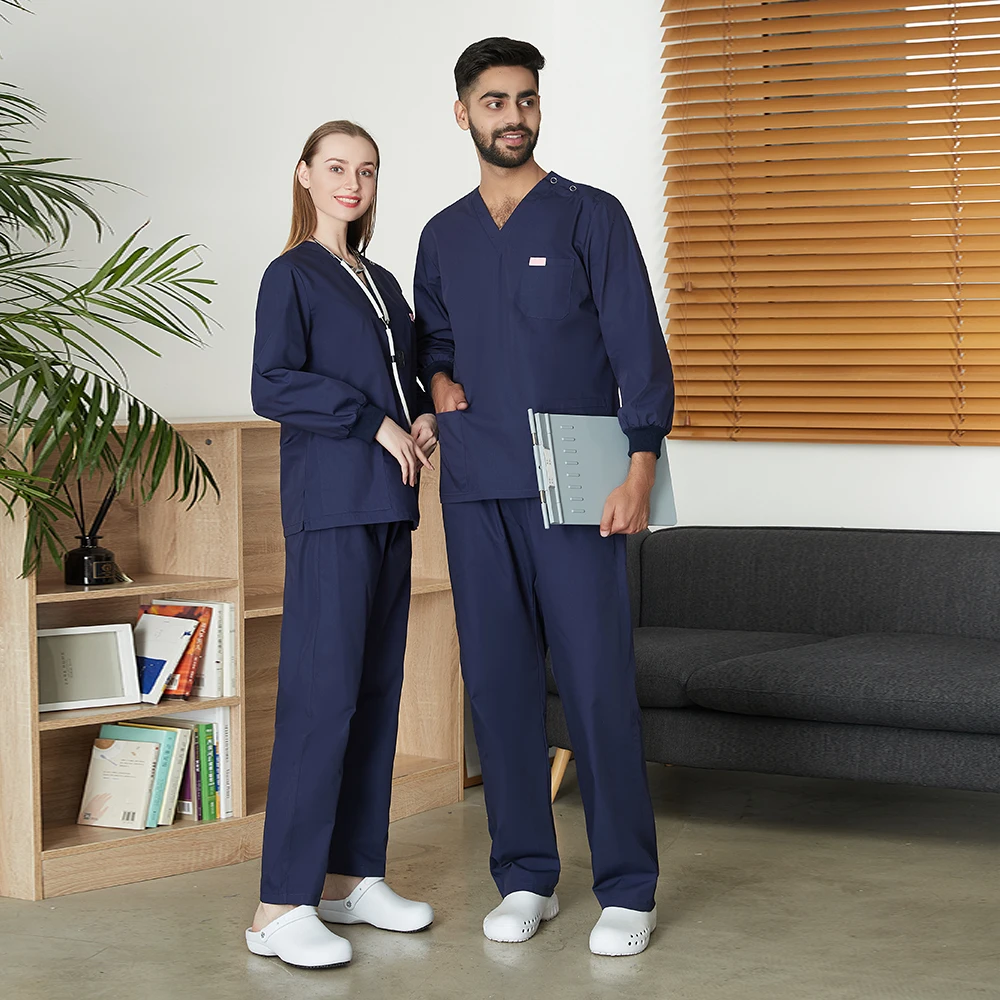 Медицинская Униформа с длинным рукавом для мужчин и женщин, хирургический халат на пуговицах, скраб-топ + штаны, медицинский костюм для медсестры, костюм для стоматолога