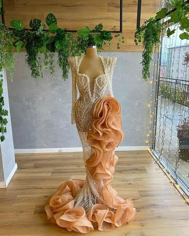 2022 арабское Aso Ebi Золотое роскошное платье-Русалка для выпускного вечера с кристаллами из бисера жемчужинами для торжественной вечеринки второй прием