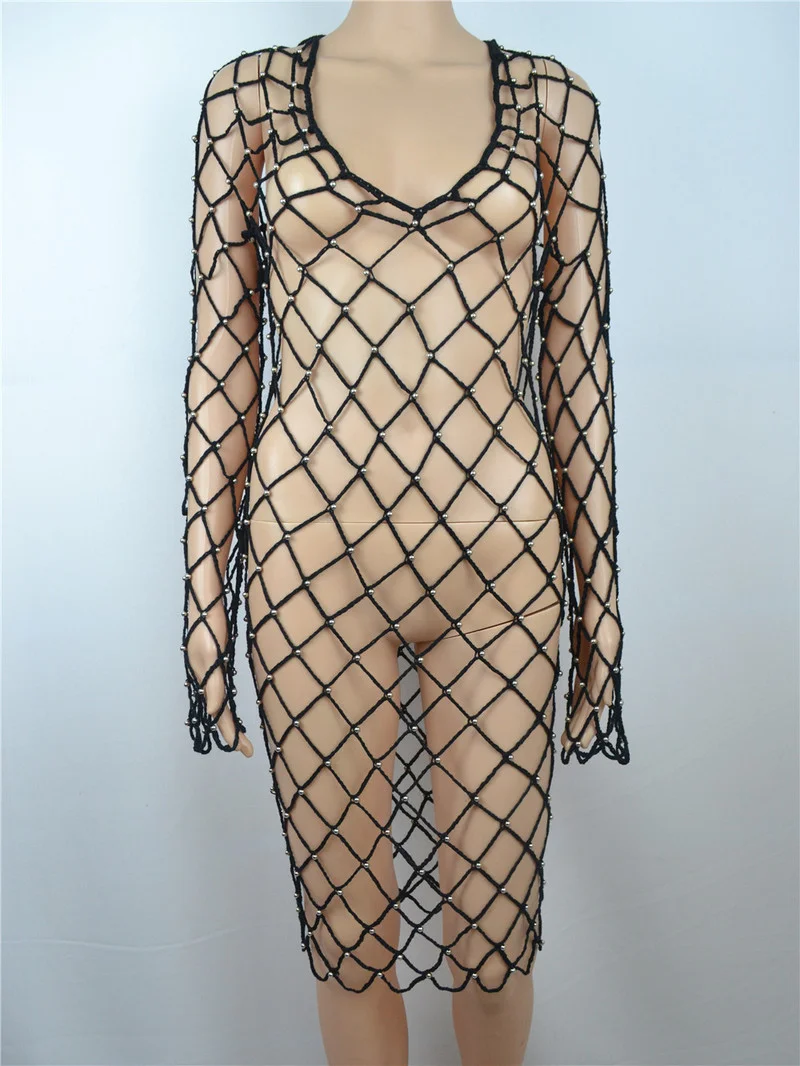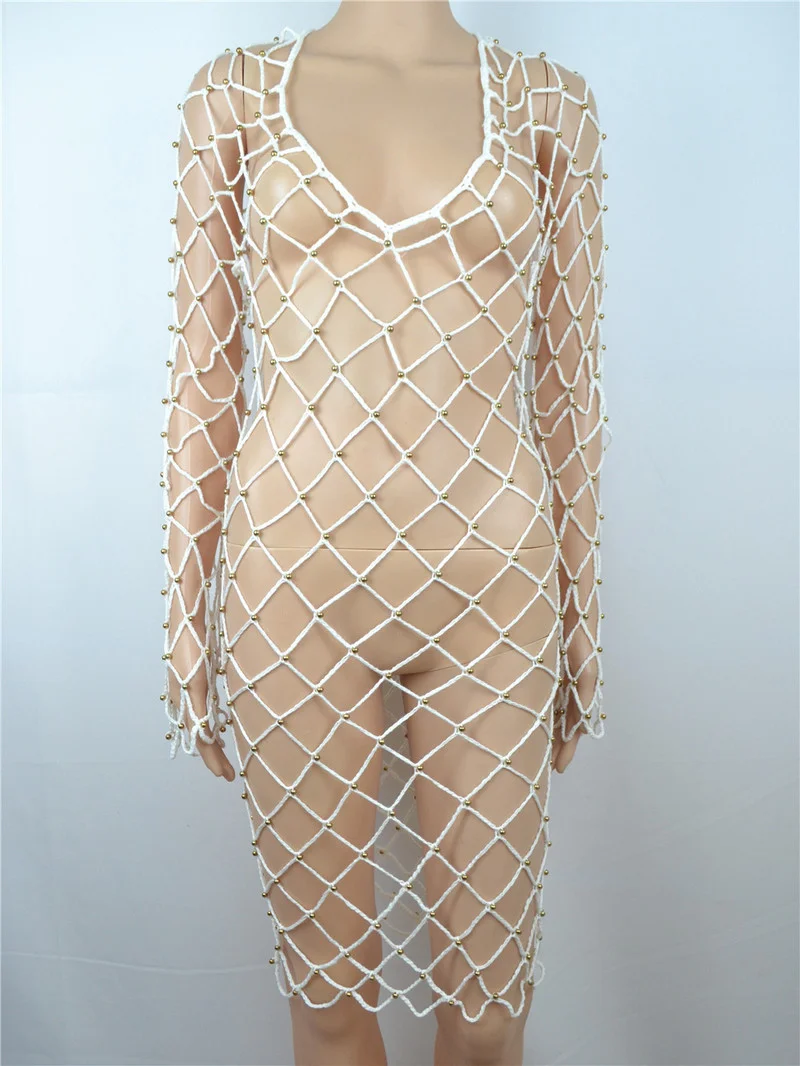 Женские сетчатые блузки с жемчужинами, летняя пляжная ажурная блузк...