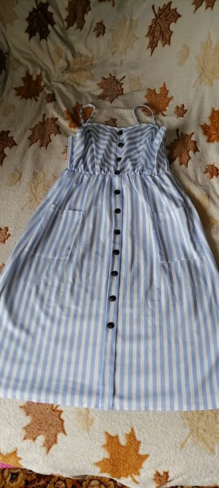 Платье как на фото. Очень классно смотрится. Пуговицы не расстёгиваются. На русский 42 - 44 заказала s