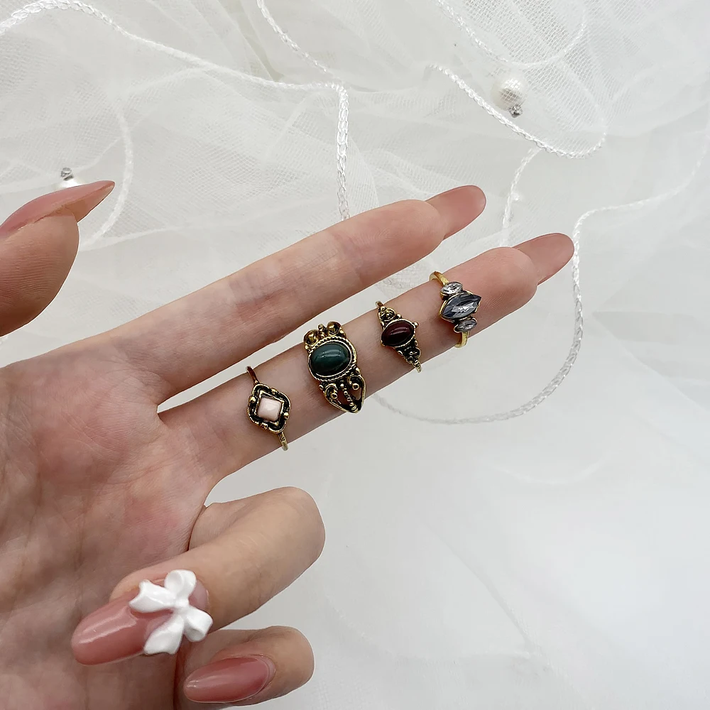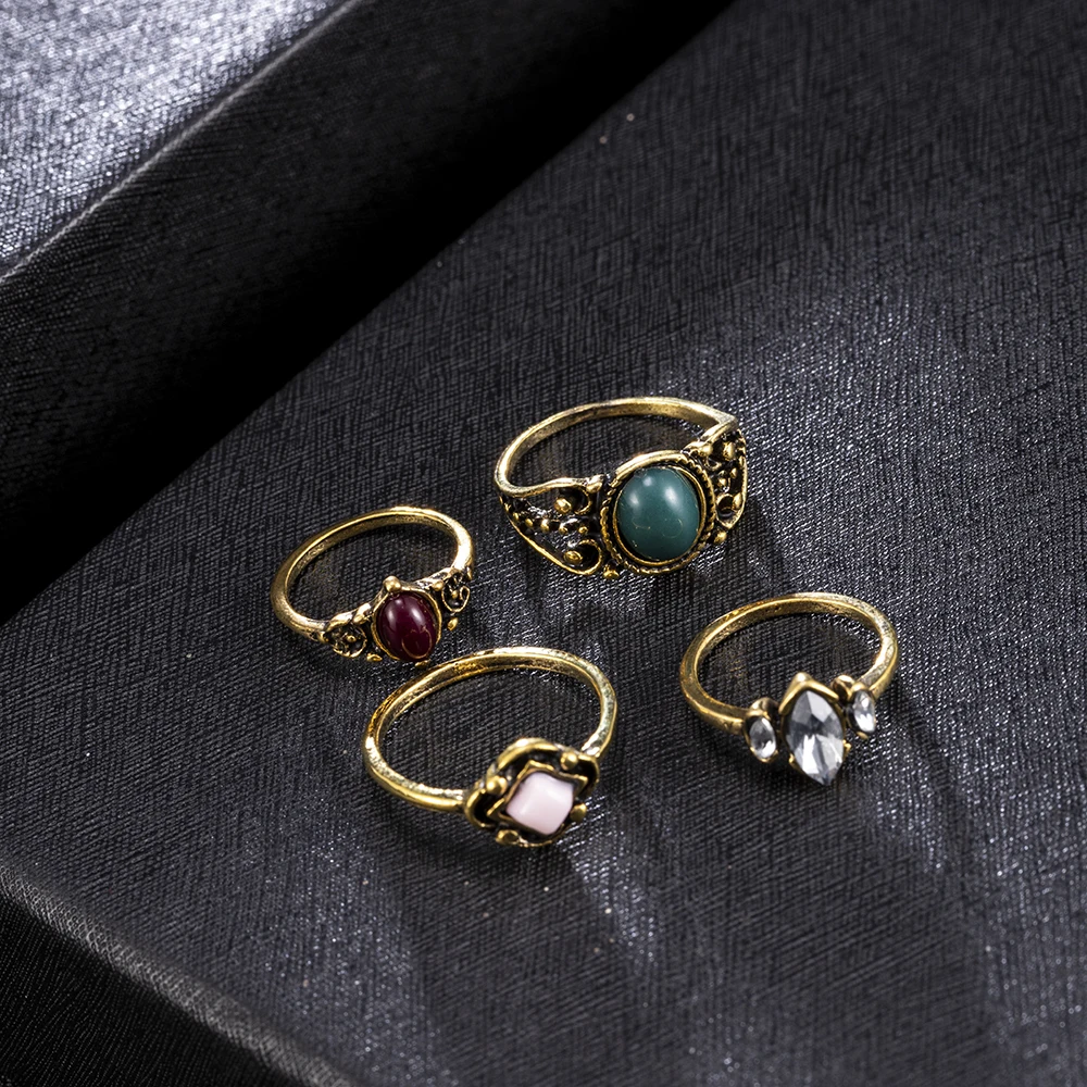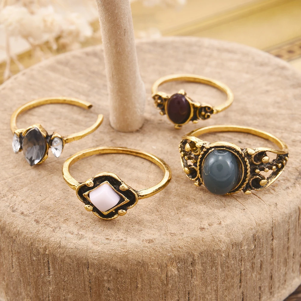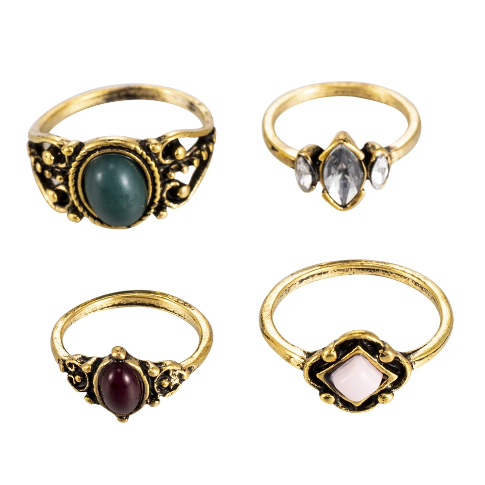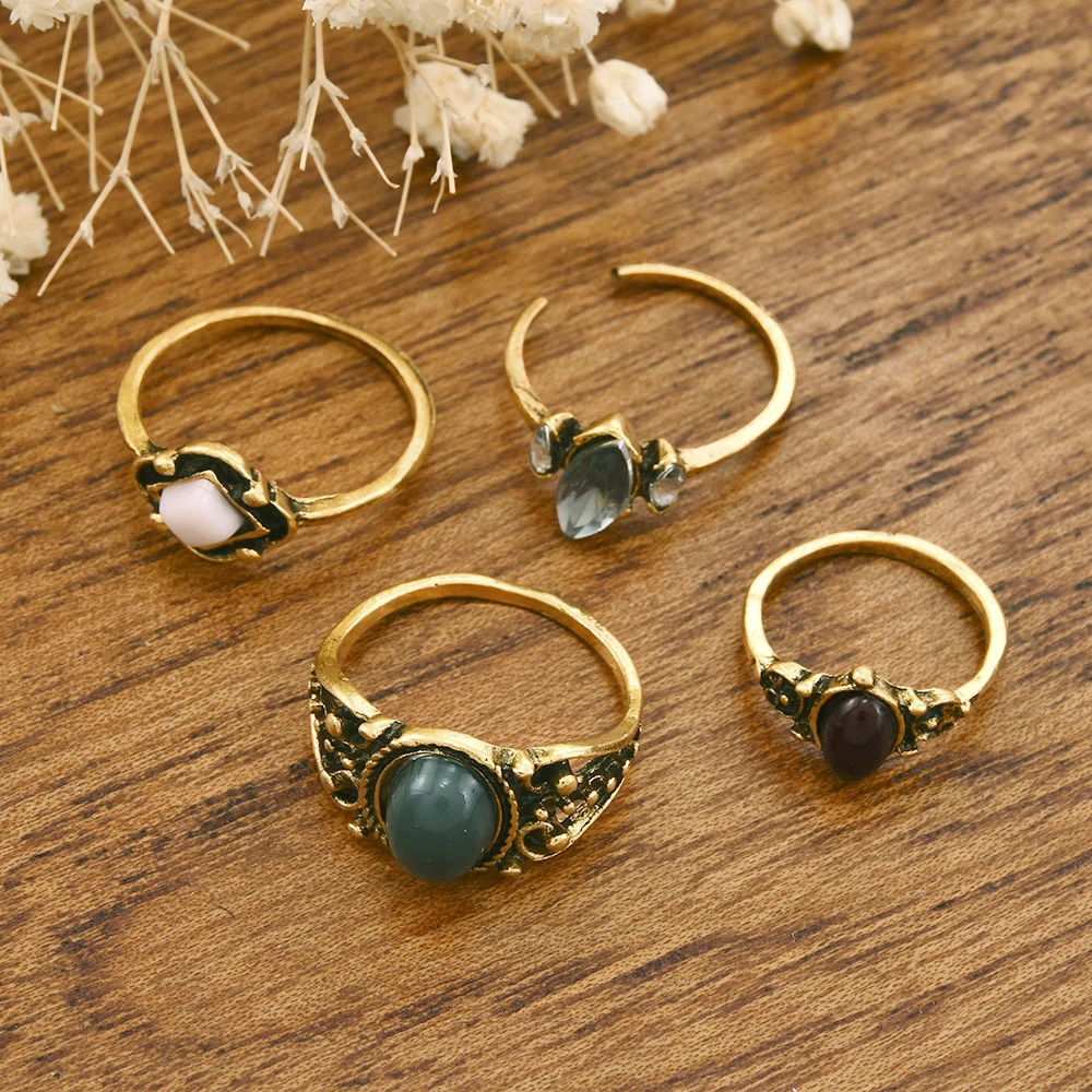 4 шт., винтажный Ретро набор колец, богемные Кристальные темно-зеленые панк кольца из натурального камня, счастливые миди кольца в стиле Бохо, набор для женщин