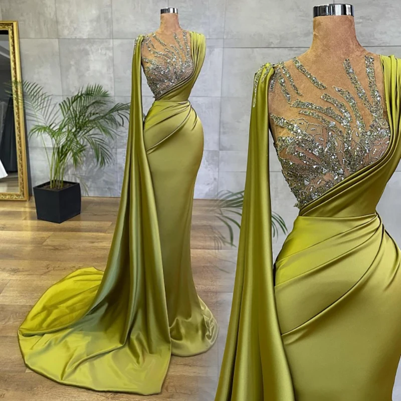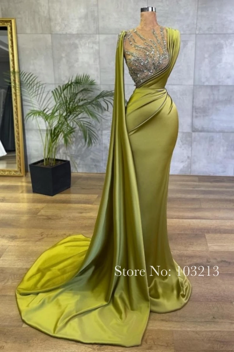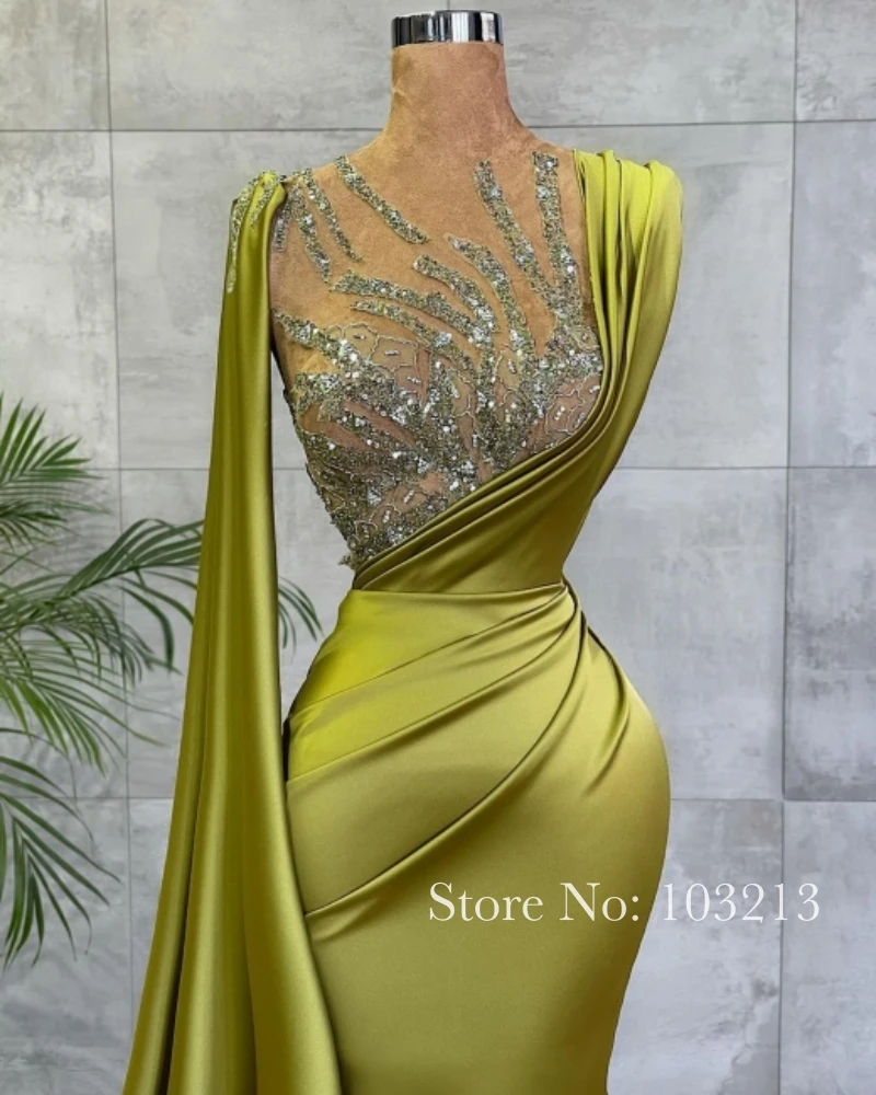Женское атласное платье-русалка, длинное вечернее платье макси с зеленой драпировкой и кристаллами, с лентой, для выпускного вечера