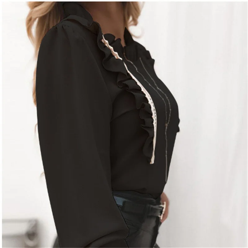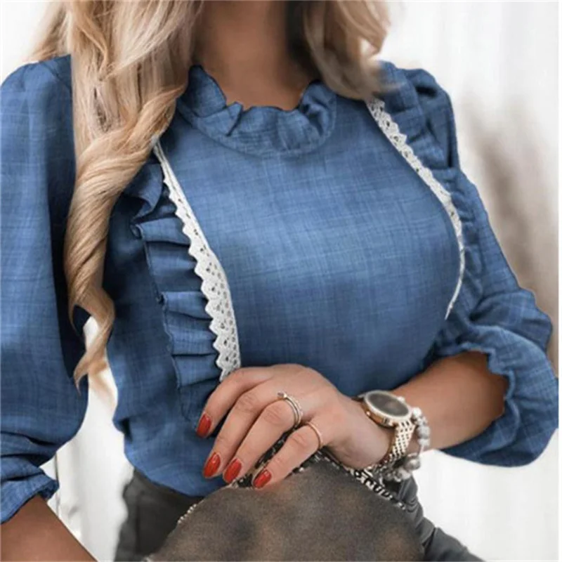 Блузка женская, с длинным рукавом, кружевная, с оборками и круглым вырезом