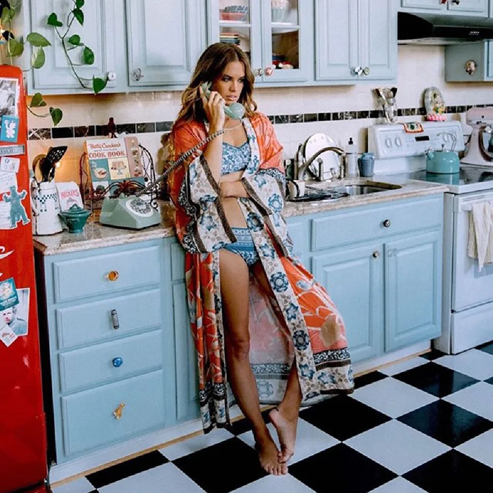 Женское длинное пляжное кимоно с богемным принтом и поясом