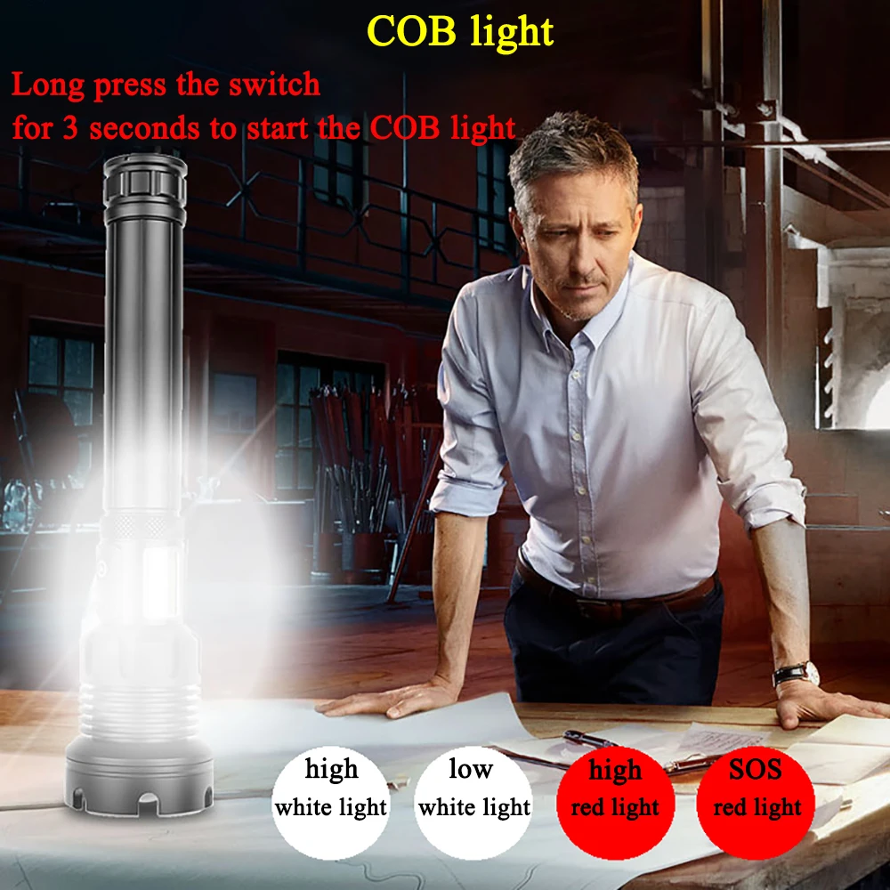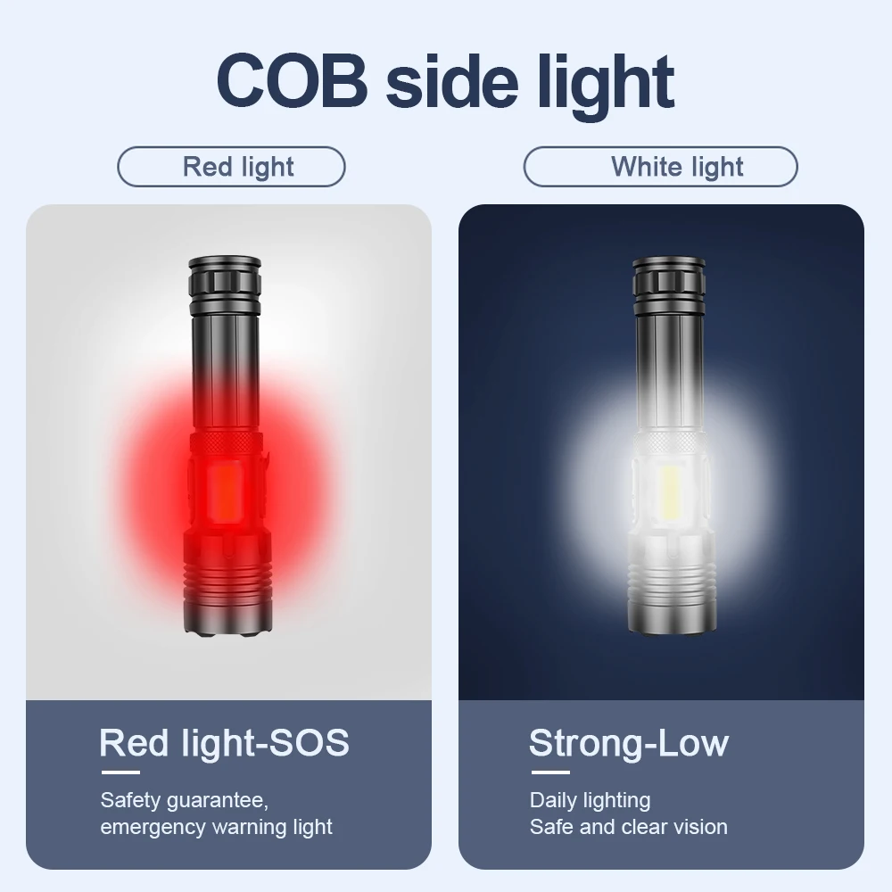 ♦Используйте новейший светодиодный индикатор XHP160 + COB, чтобы получить максимальную яркость♦3 режима (сильный светильник-низкий светильник-вспышка), двойной щелчок, чтобы открыть режим COB♦Режим COB: белый светильник, сильный светильник-белый светильник, слабый светильник-красный светильник, сильный светильник-красный светильник♦Usb-вход, удобно заряжать фонарик в различных ситуациях♦Быстрый выход USB, может использоваться в качестве мобильного источника питания, удобно заряжать электронные продукты♦Дисплей питания: потребление энергии скачет и уменьшается один раз, а оставшаяся мощность хорошо известна♦Используйте 2*18650 или 2*26650 аккумуляторных батарей. Внутренняя проводка использует высокоэффективную схему повышения для максимального использования аккумулятора♦Телескопический зум, режим астигматизма-прожектора, удобный в использовании в различных ситуациях♦Водонепроницаемый класс IPX6, можно использовать в дождливые дни, нельзя замачивать в воде