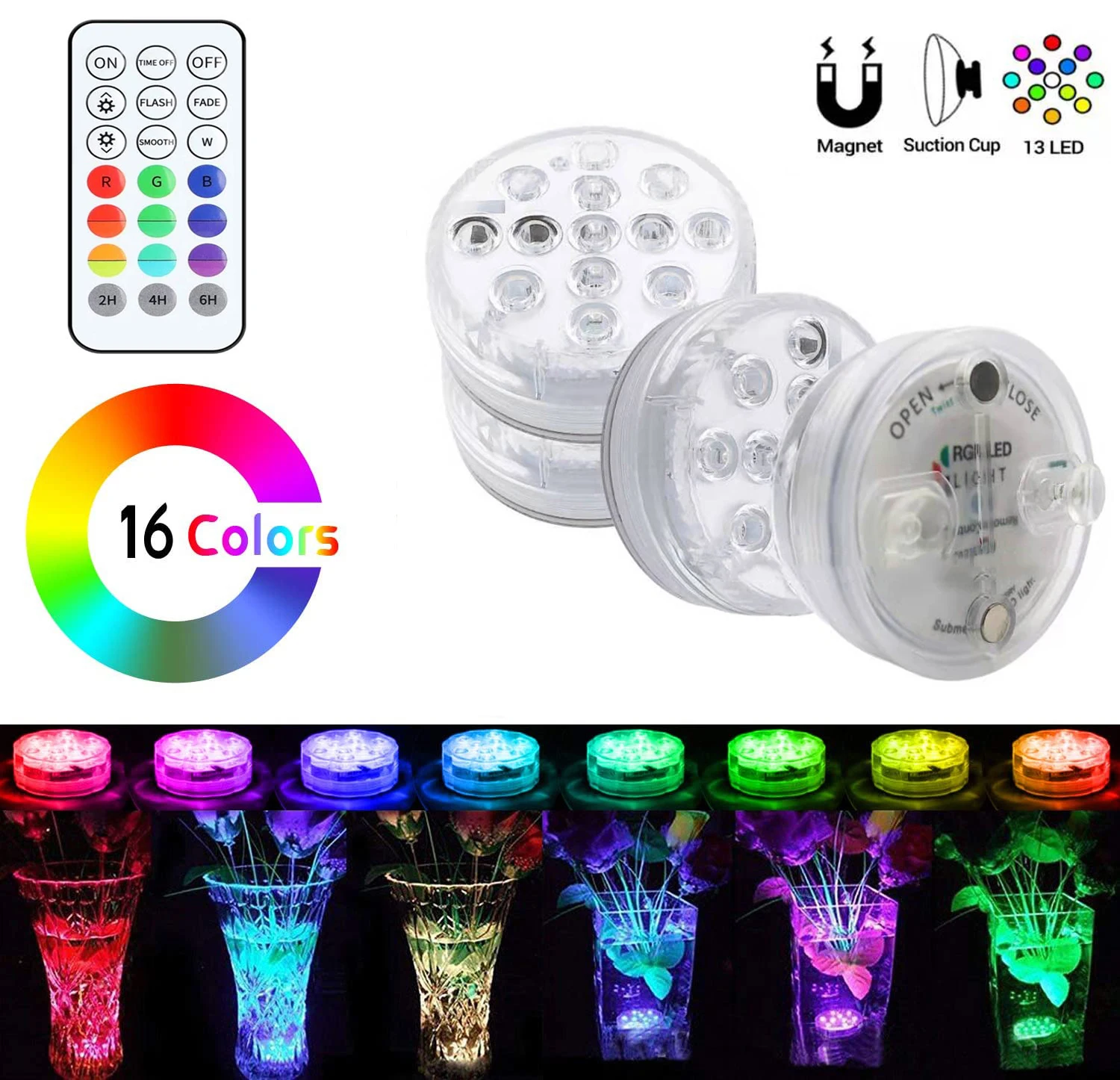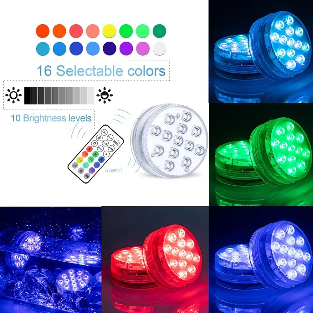 IP68 Водонепроницаемый-он разработан с полностью водонепроницаемой структурой, герметичным и водонепроницаемым резиновым уплотнительным кольцом, который хорошо работает во влажной и сухой среде. 13 ламповых бусин и 16 цветов-обновленная версия, с 13 ламповыми бусинами, ярче и ярче, чем другие подводные светильники для пруда. 24-кнопочный дистанционный пульт гарантирует, что вы можете с легкостью выбрать 16 разных статических режимов и 4 динамичных режимов изменения цвета нажатием одной кнопки. Магнит и присоска-может быть установлен с магнитным утюгом для дайвинга или присоской. Широко используется-наш цветной светодиодный светильник для дайвинга широко используется в бассейнах, фонтанах, ваннах, аквариумах и т. д. Его также можно использовать как декоративный светильник для дней рождения, свадеб, Хэллоуина и Рождества.