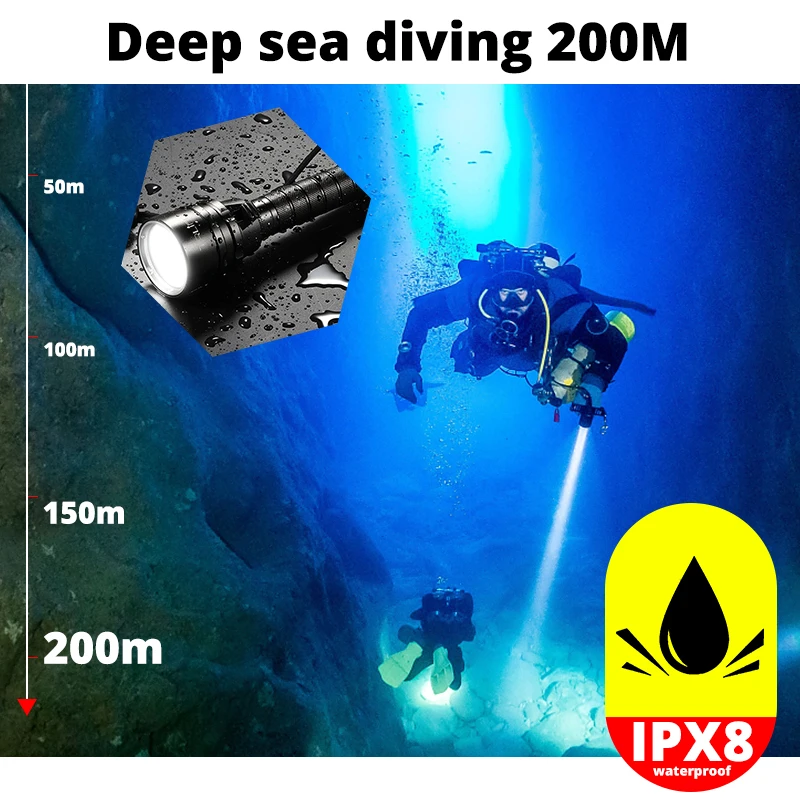 IP8-rated водонепроницаемость, профессиональное оборудование для подводного плавания с аквалангом и сноркелингом. Идеальный открытый фонарик для рыбалки, дайвинга, плавания, пеших прогулок, парусного спорта, кавинга.