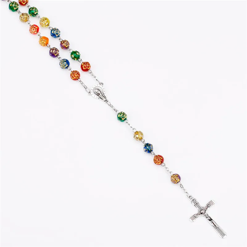 8 мм модные религиозные украшения унисекс католический христианский Иисус красочные бусины с розами Дева Мария кулон крест четки ожерелье