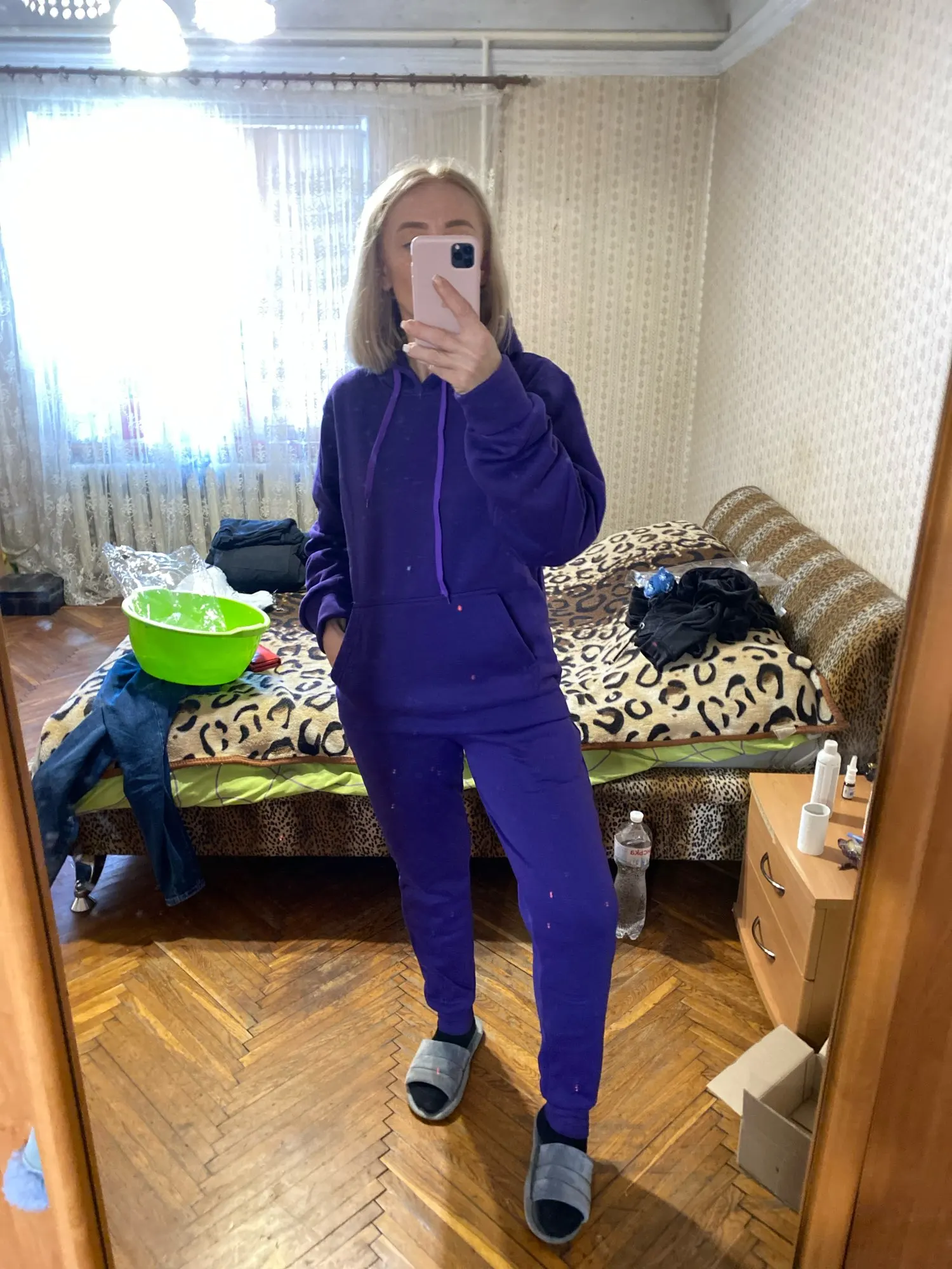 Фото к сожалению не передаёт цвета костюма. Цвет очень красивый фиолетовый. Когда заказывала костюм ориентировалась на размерную сетку продавца. При заказе весила 75 кг. Взяла XL с мыслями что чуть будет великоват. Пока ко мне дошёл , скинула 9 кг. Шёл костюм в Украину месяц. Так вот если бы я не похудела на 9кг то костюм наверно был бы в облипку. Качество ткани скрипучая синтетика но при этом очень тёплый. Для сельской ))))) местности сойдёт.