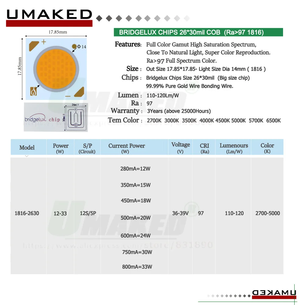 Светодиодный чип COB 18x35Mil 3 5 7 12 15 20 30 36 50 Вт CRI92 36 в...