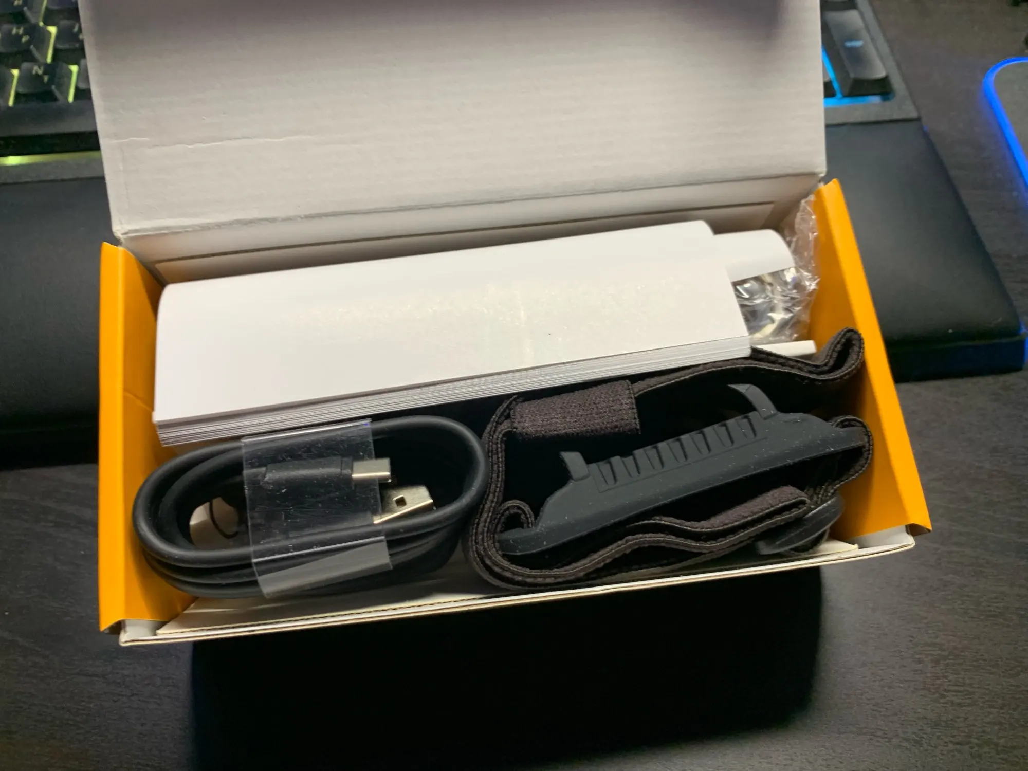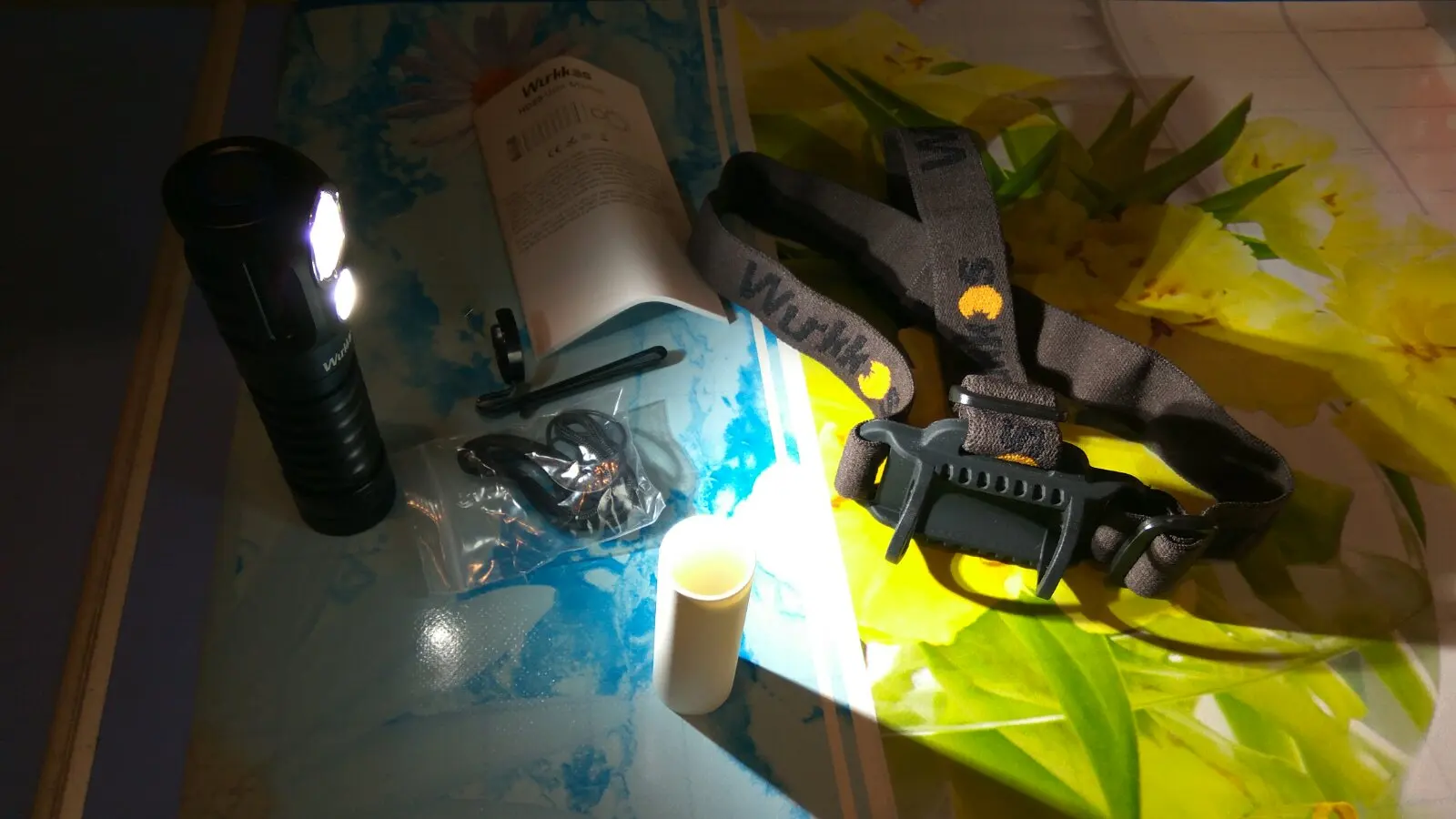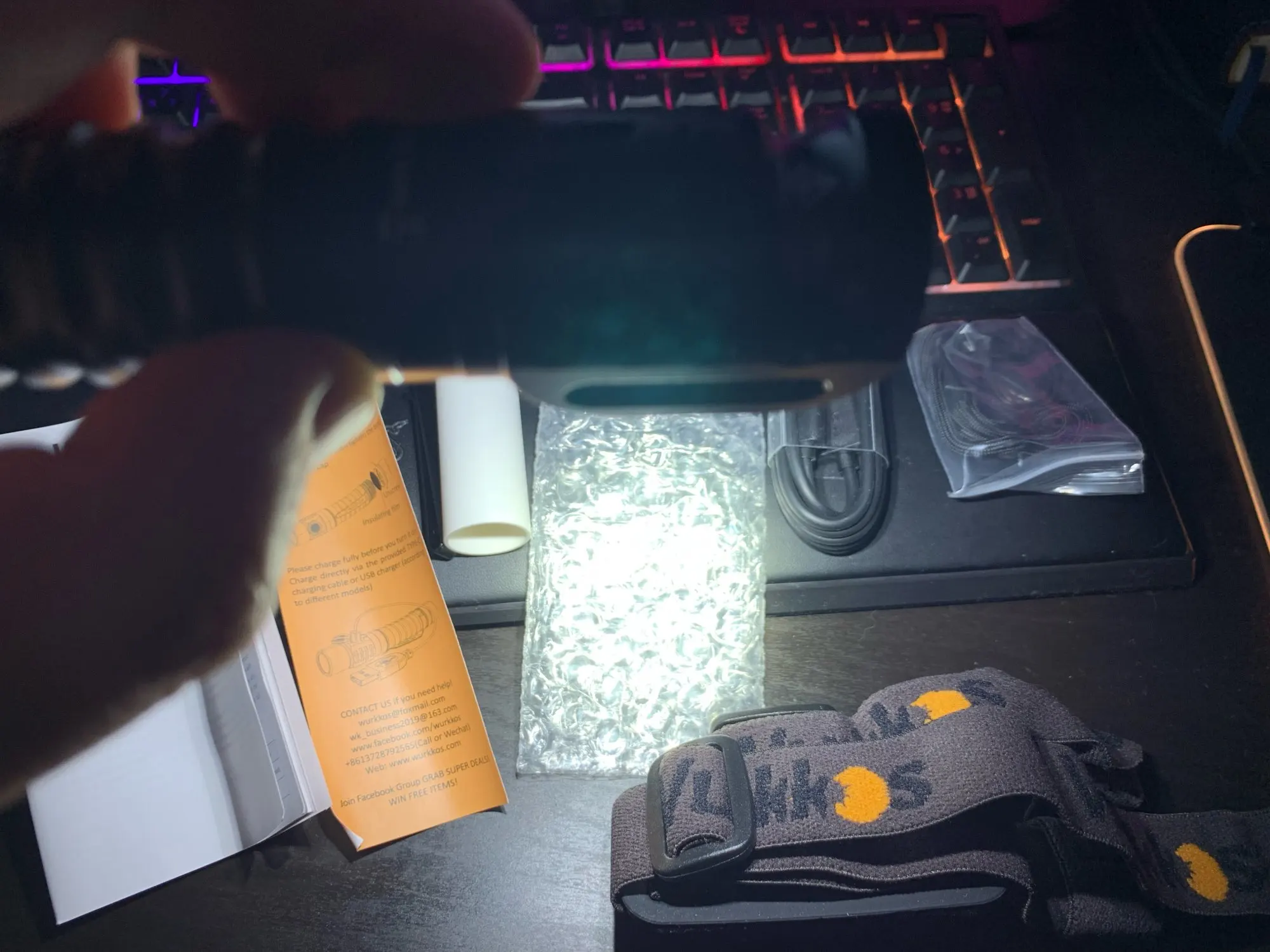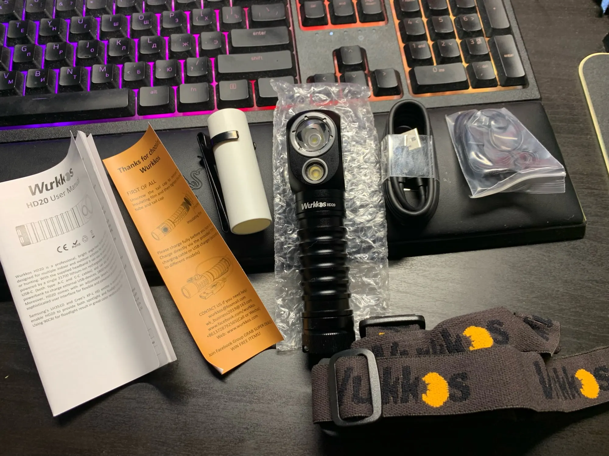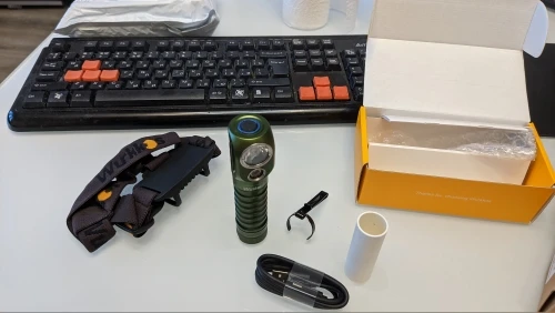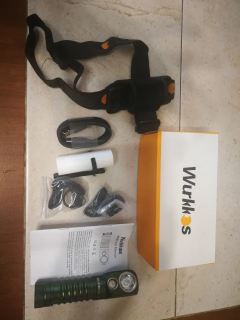 Все как в описании. Сам фонарик, резиновое крепление на оголовье (держится плотно), съемная клипса, кабель зарядки, переходник для тонкого аккумулятора и шнурок. Инструкция на разных языках, в том числе и на русском. Я взял себе в зеленой расцветке. В целом понравился. На открытом капоте цепляется на магнит, что позволяет хорошо освещать подкапотное пространство. Доставка в течении 5-6 дней. Вроде все.