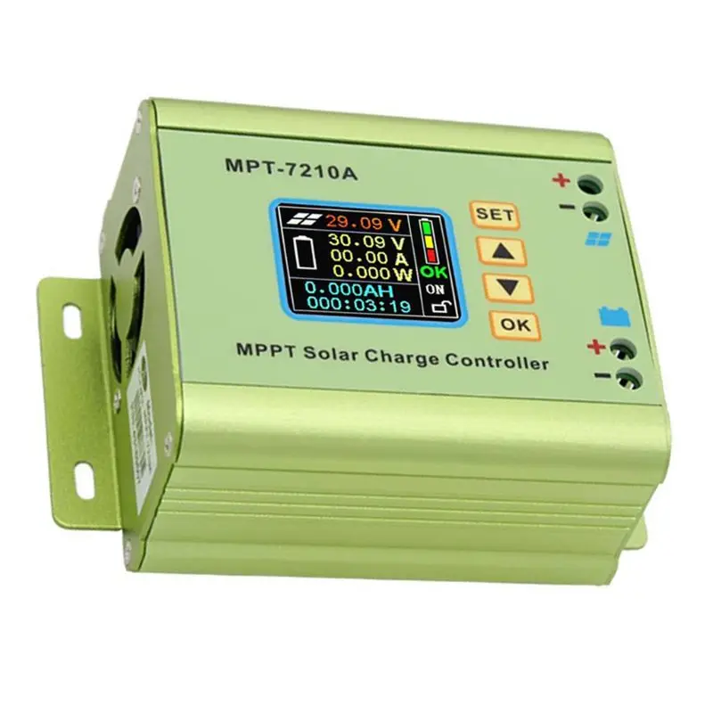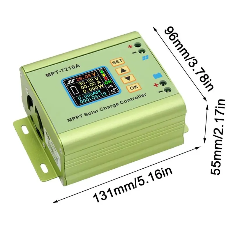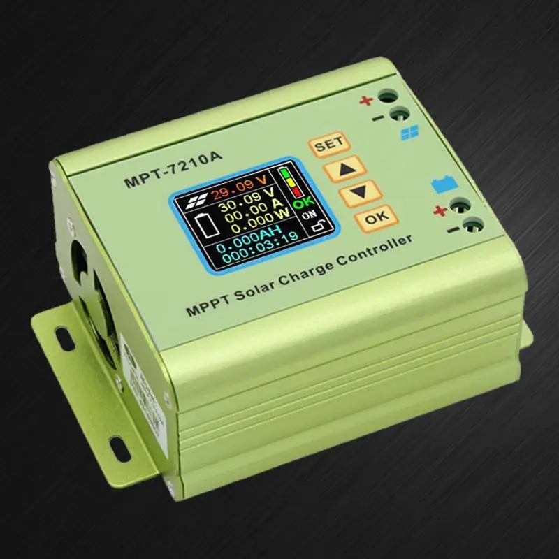 P82F MPT-7210A LCD MPPT Контроллер заряда солнечной панели из алюминиевого сплава для LiPo батареиOOTDTY100% новый товар высокого качества.Особенности:Совместимость с 24V / 36V / 48V / 60V / 72V аккумуляторная батарея системы, можно установить выходное напряжение и ток в соответствии с фактическими потребностями.Инновационная технология MPPT и высокая эффективность отслеживания, могут улучшить генерируемую энергию.Высокоскоростной и высокопроизводительный дизайн, отлично подходит для использования на солнечной батарее.Отличная теплоотдача: использует передовую технологию контроля температуры вентилятора для быстрого контроля тепла.Чехол из алюминиевого сплава, прочный для использования.Простой интерфейс работы: ЖК-экран отображает ток, ток, мощность, время зарядки и т. д.Режимы работы: выбор MPPT и DC-DC (MPPT для применения фотоэлектрических панелей и DC-DC для увеличения источника питания).Варианты зарядки: подходит для литиевых батарей и батарей.Встроенный 20 групп данных для пользователя для установки и хранения.Максимальная выходная мощность 600 Вт, подходит для солнечной панели 100-600 Вт.Защита от обратного подключения: защита от обратного подключения MOS на входной и выходной концах для эффективной защиты контроллера и аккумулятора.Защита от перегрузки: контроллер автоматически отключит цепь при перегрузке.Широкое применение: аккумулятор и литиевый аккумулятор, бытовая фотоэлектрическая система генерации энергии, Солнечная уличная лампа и т. д.Характеристики:Модель: MPT-7210AДисплей: 160x128 TFT цветной ЖК-дисплейВходное напряжение: DC12-60VВыходной ток: 0-10 А регулируемыйВыходная мощность: 20-600 ВтРежим работы: MPPT, DC-DCВыходное напряжение: DC15-90v, регулируемый для 24 В/36 В/48 В/60 в/72 вМатериал: алюминиевый сплавРазмеры: approx.131x96x55mm/5.16x2.17x3.78inОсновной цвет: зеленыйКоличество: 1 шт.Примечание:Нет розничной упаковки.Возможны отклонения в 0-1 см вследствие измерений вручную. Пожалуйста, убедитесь, что вы не возражаете, прежде чем сделать ставку.Из-за разницы между различными мониторами изображение может не отражать фактический цвет изделия. Спасибо!Посылка включает в себя:1 х MPPT Солнечный контроллер