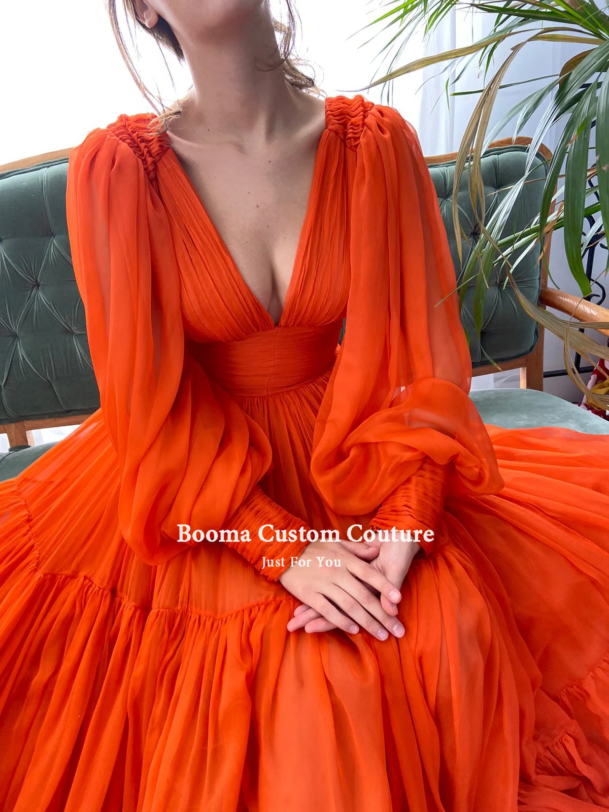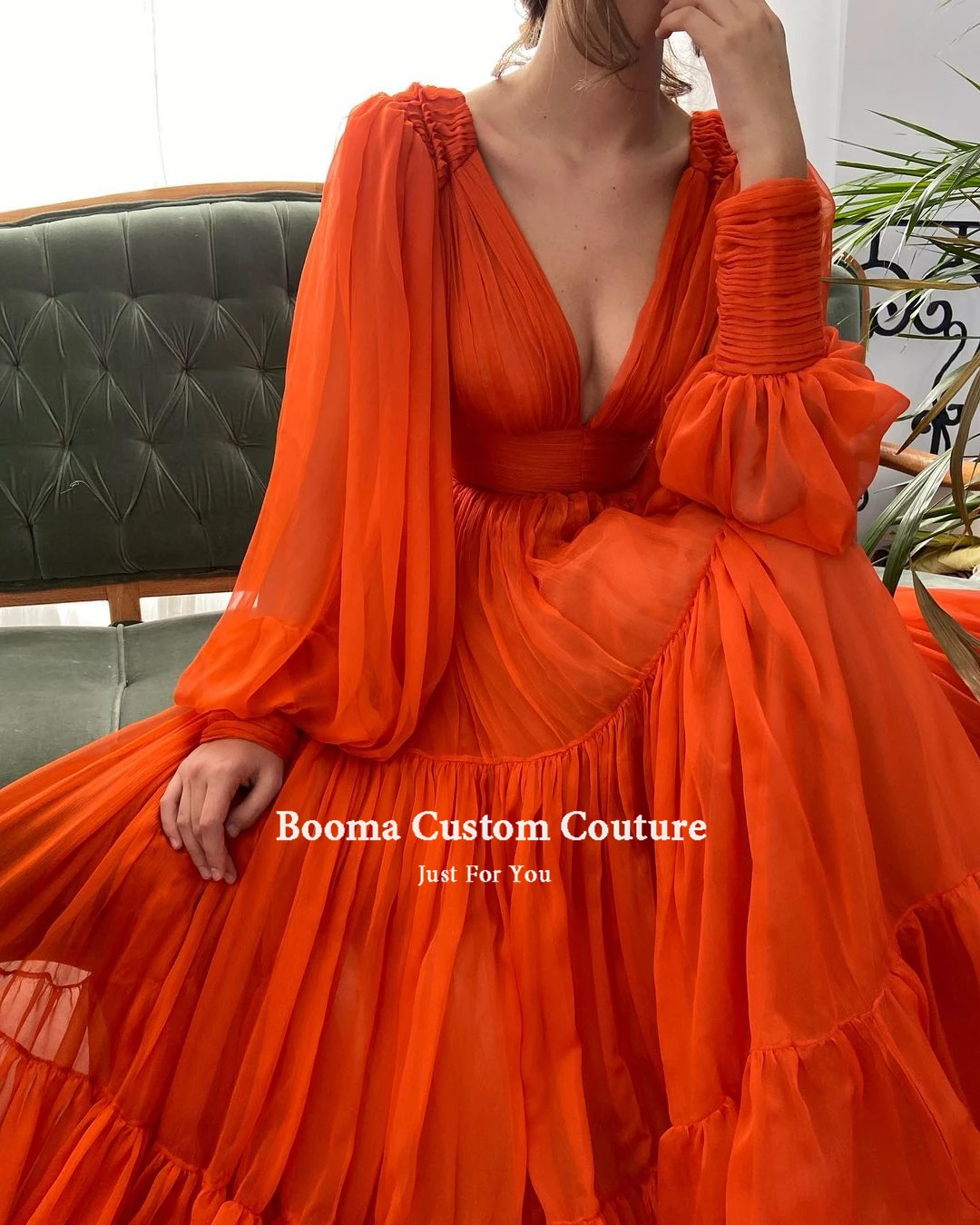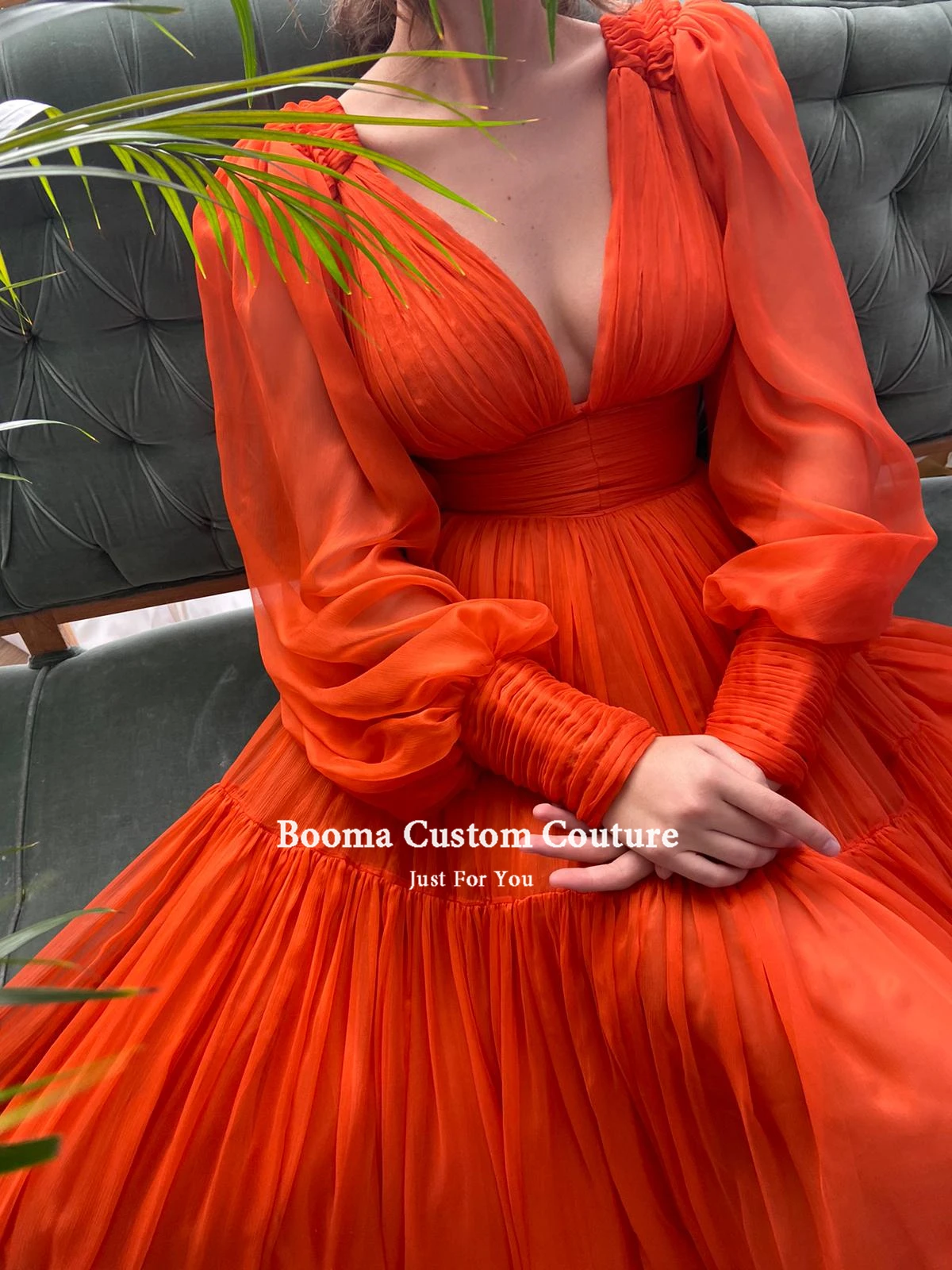Booma Простой Оранжевый шифон платье для выпускного вечера с длинными рукавами сексуальное нижнее белье с глубоким v-образным вырезом плиссированные вечерние платья трапециевидной формы Свадебная вечеринка платья размера плюс
