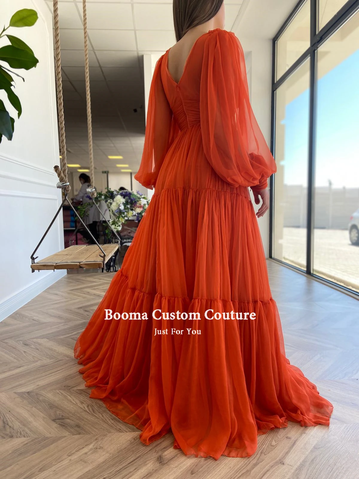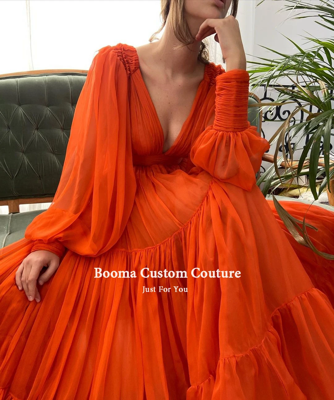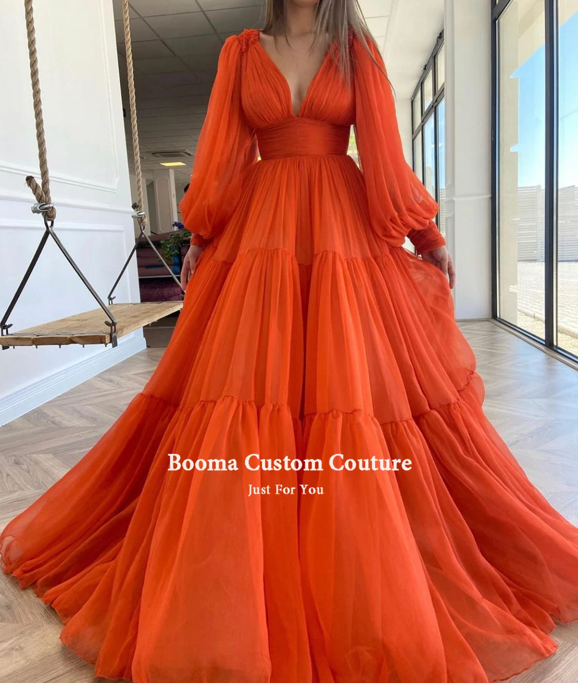 Booma Простой Оранжевый шифон платье для выпускного вечера с длинными рукавами сексуальное нижнее белье с глубоким v-образным вырезом плиссированные вечерние платья трапециевидной формы Свадебная вечеринка платья размера плюс