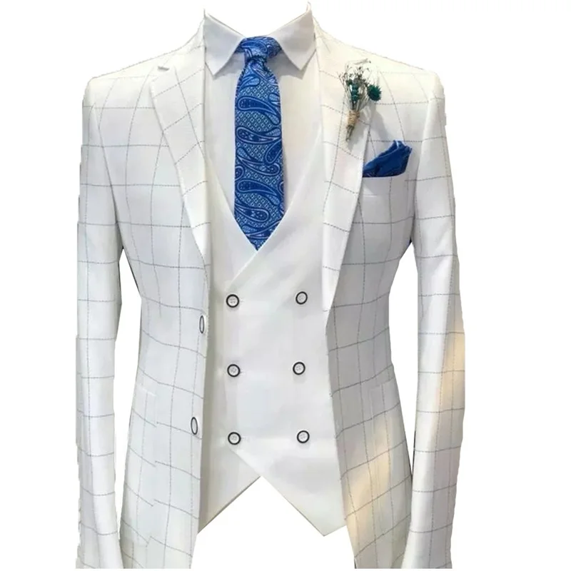 Мужские белые костюмы 3 шт., свадебный смокинг с узором в клетку, одежда для вечеринки, красивые костюмы на заказ, пальто + жилет + белые брюки