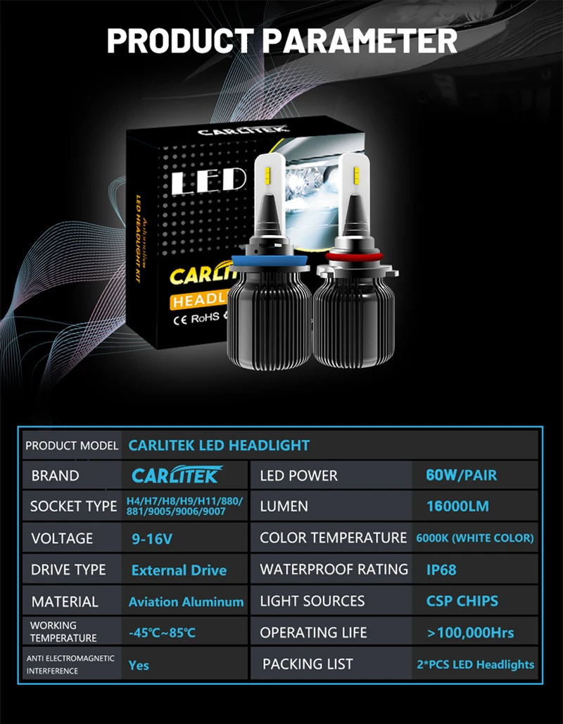 Светодиодные фары Carlitek, 880 лм, H8, H4, 881, H7, 9007, HB5, H27...