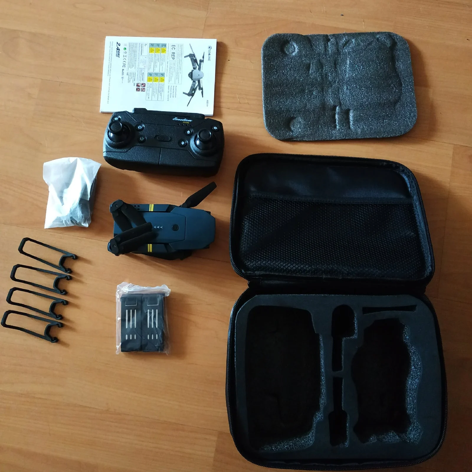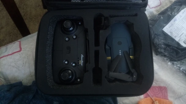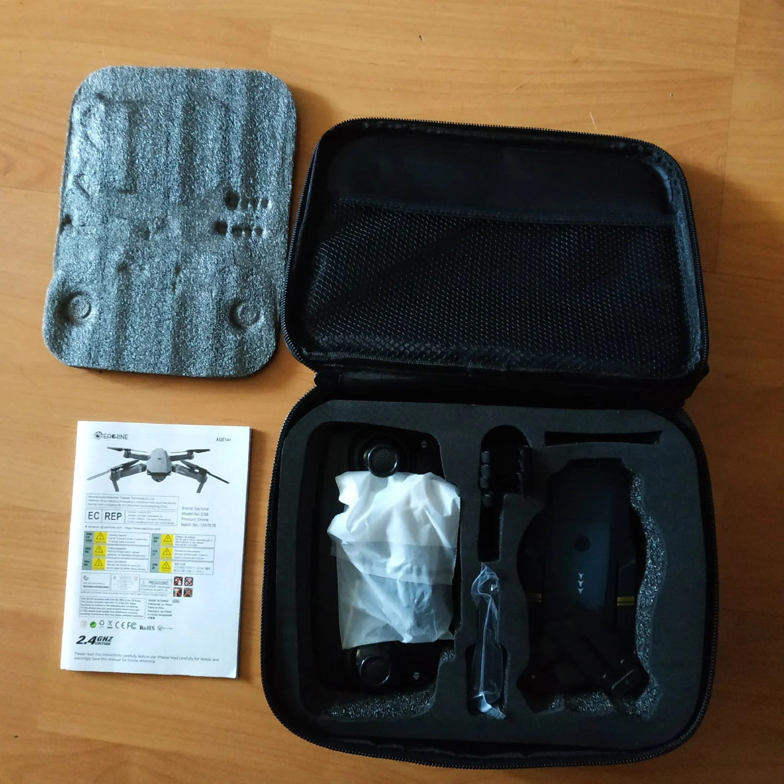 Пришёл E55 курьером DHL прямо к квартире через 4 дня после заказа. Упакован в кейс довольно качественно. Комплектация на фото. ,,, ,,, Подключить камеру получилось не сразу через приложение "Eachine tec", а после установки на телефон приложения "JU UFO"... ,,, ,,, Намного качественнее, чем дрон E99 в той же ценовой категории.