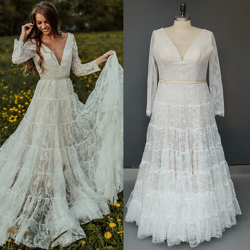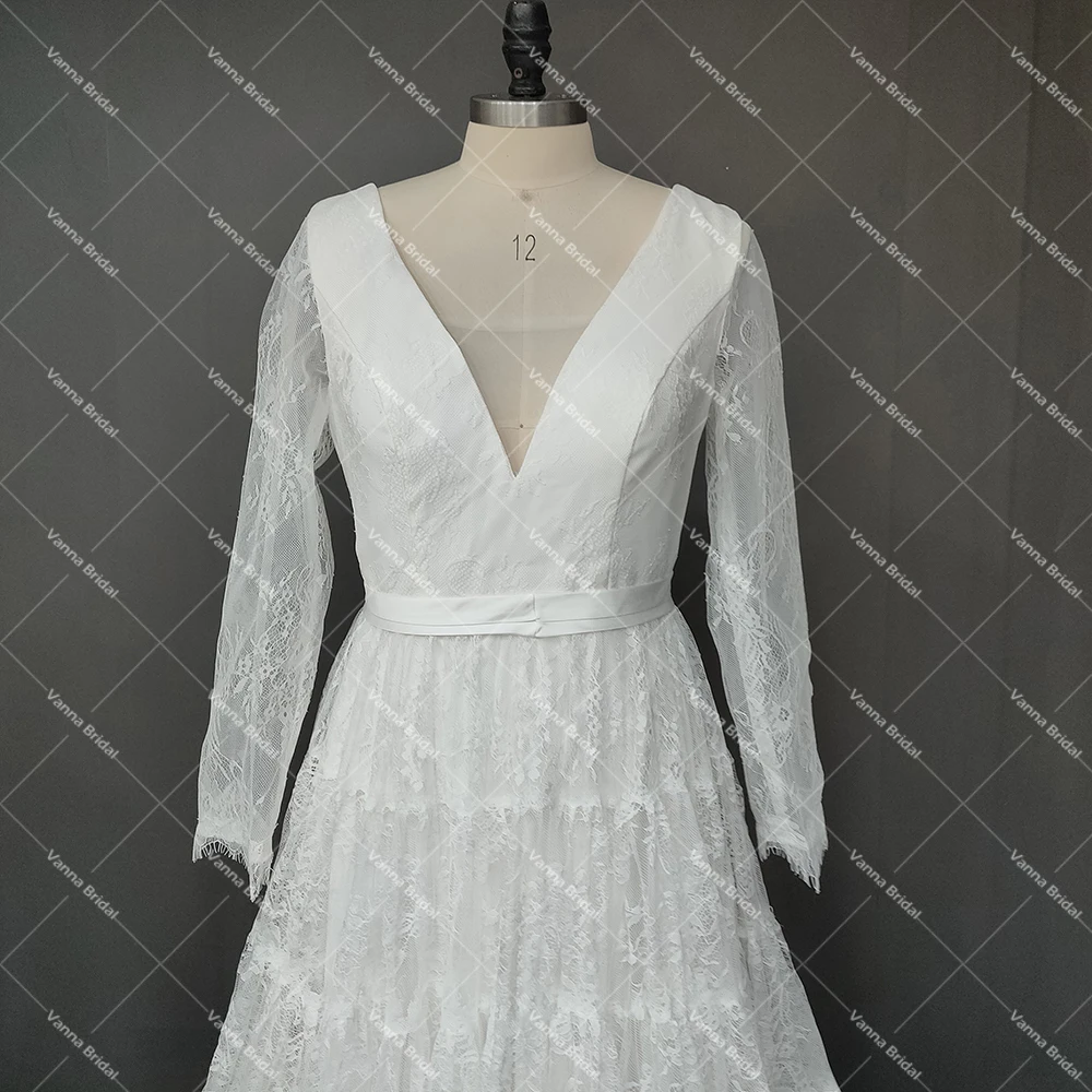 Многоярусное кружевное свадебное платье в стиле бохо с длинными рукавами, открытой спиной, глубоким V-образным вырезом и лентой, Тюлевое садовое пляжное ТРАПЕЦИЕВИДНОЕ платье для невесты 2021, 10152