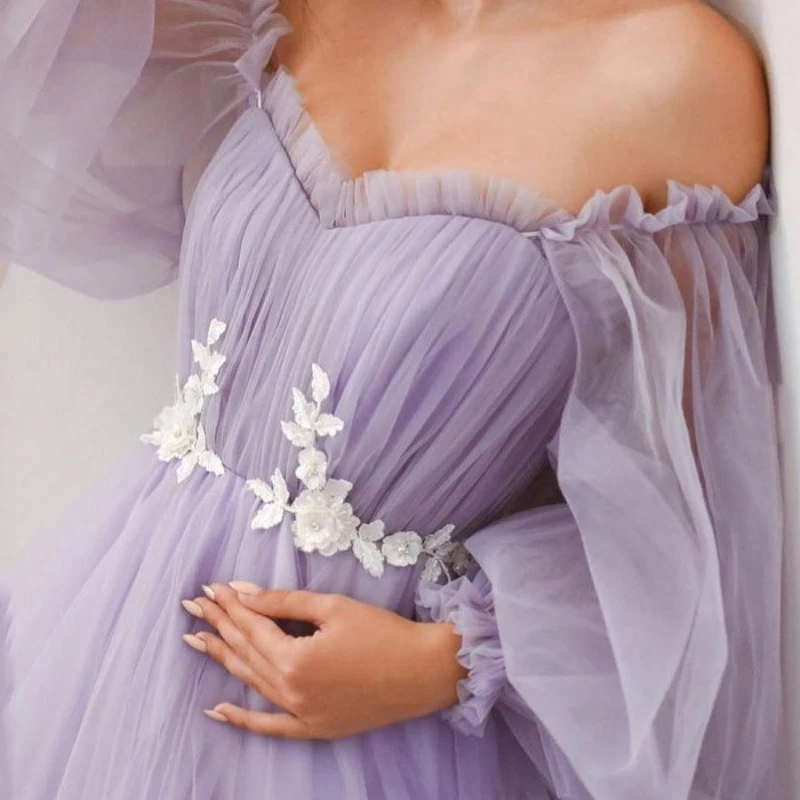 Thinyfull бледно-лиловый Тюль Кружева аппликация для вечернего платья пышные рукава платья с открытыми плечами платье трапециевидной формы платье-принцесса для выпускного вечера 2021 для беременных, индивидуальный пошив, размеры