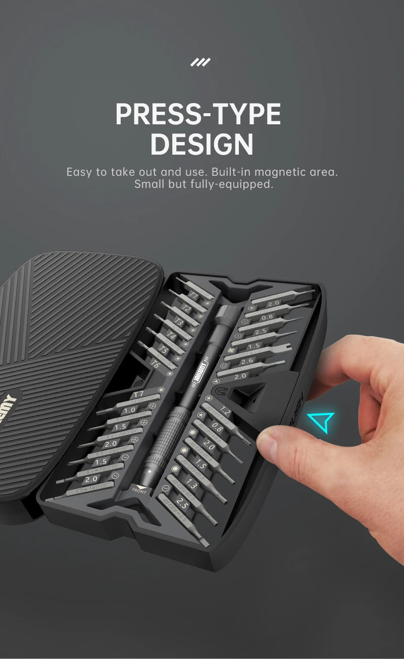 Характеристика:-- Бренд: JAKEMY-- Характеристики: 26 в 1(24 бит, 1 ручка, 1 ящик для хранения)-- Материал бит: материал CRV-Характеристики: набор магнитных отверток-- Применение: смартфон/планшет/дисплей/камера/ноутбук/компьютерТип:-- Torx:T1/T2/T3/T4/T5/T6/T7-- Шестигранный: H1.3/H1.5/T2.0-- Hex: 1,5/2,0/2,5-- Phillips: 1,0/1,5/2,0-- Pentalobe: 0,8/1,2/2,0-- Три крыла: Y0.8/Y2.5-- Противостояние: 1,5-Треугольник: 2,0-- U-образный: U2.6Посылка:-- 1 * Набор прецизионных отверток