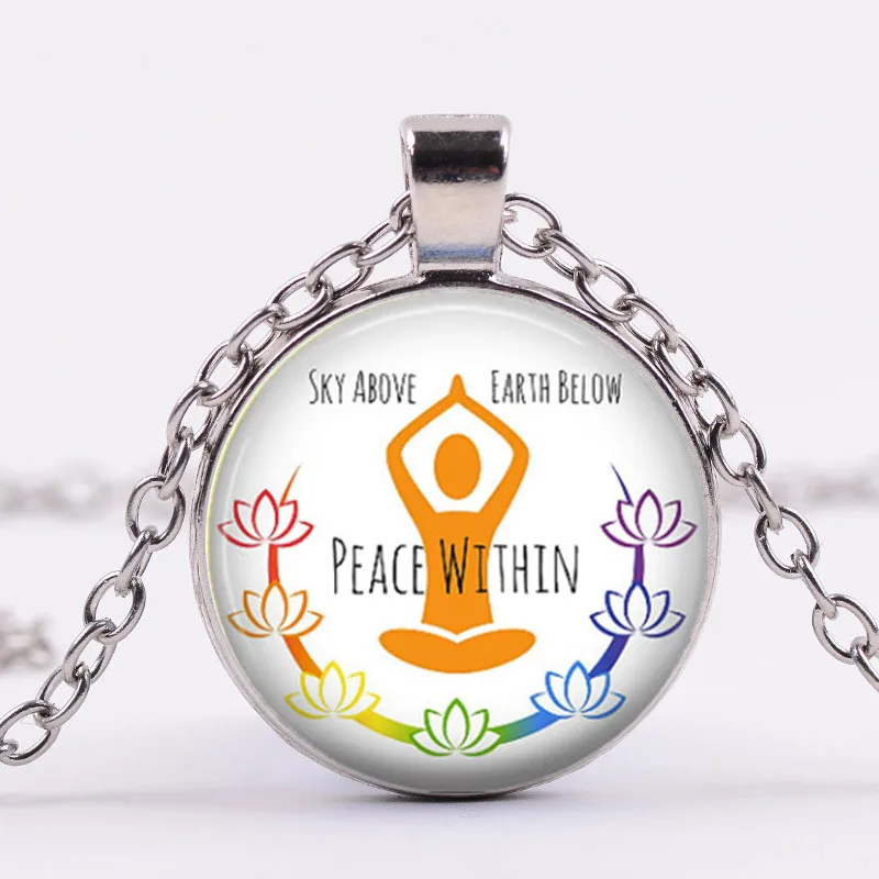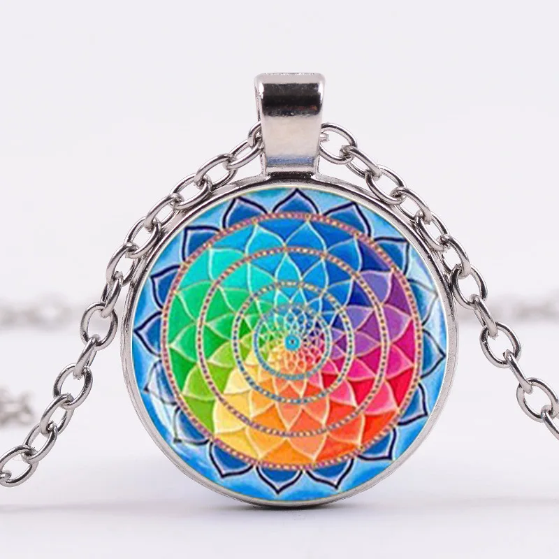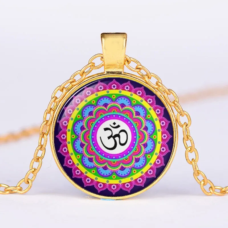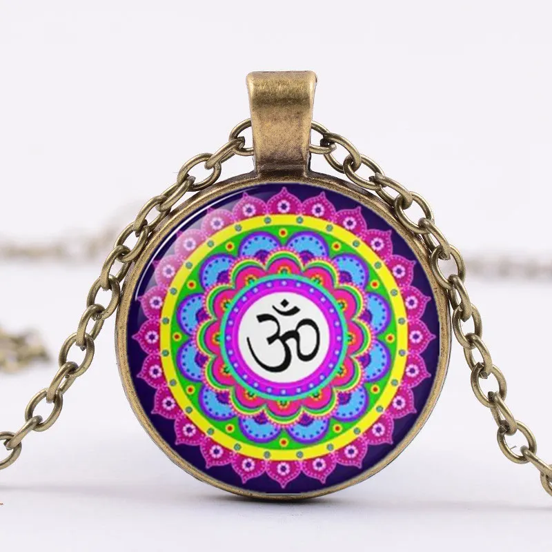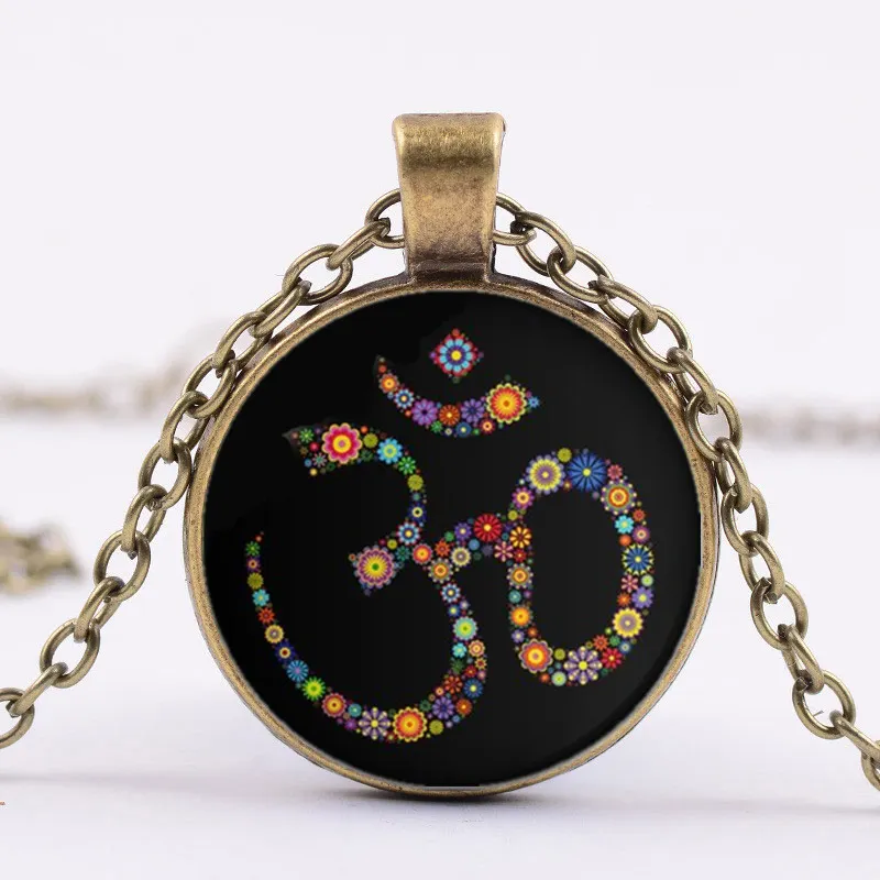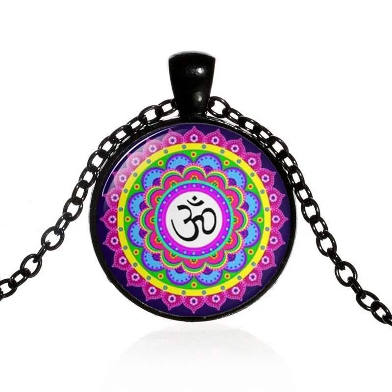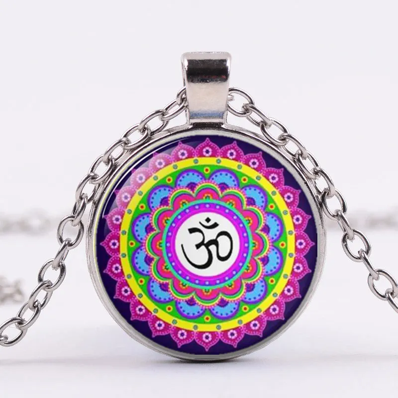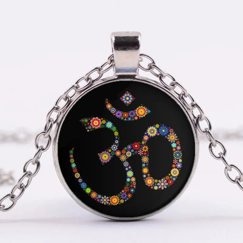 Индийское колье на санскрите с символом Ом АУМ Будда Лотос посеребренный цветок жизни Мандала искусство стеклянная цепочка Ювелирные изделия