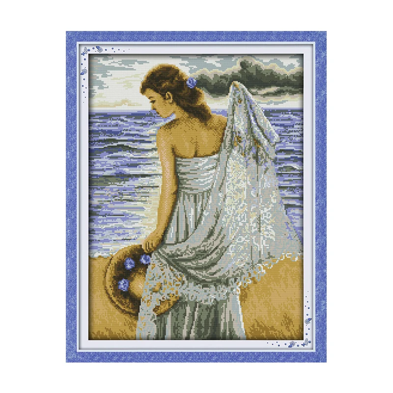 Joy Sunday Вышивка крестом узор Девушка у моря печать на ткани вышивка крестом 11CT 14CT DIY Ручная вышивка иглы комплекты ниток