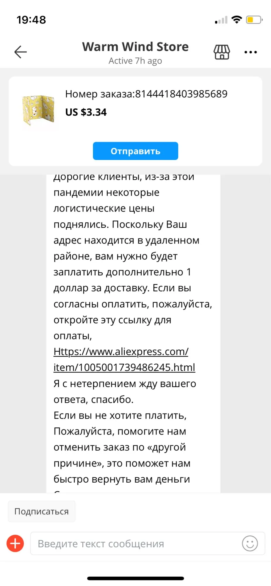Заказала , никто ничего не отправил , через неделю мне пришло сообщение с просьбой доплатить или отменить мой заказ. Я им ответила что доплачивать не буду и отменять тоже , если их не устраивает , то они сами могут отменить заказ . В итоге мне «отправили» мою посылку и через 2 недели при отслеживании посылки вылезло сообщение что она «отменена продавцом»!!! Я не могла открыть спор и пришлось писать в тех поддержку . МОЯ ХУДШАЯ ПОКУПКА НА АЛИЭКСПРЕС!!!!!!!!
