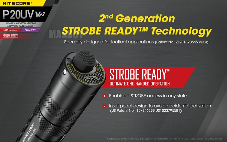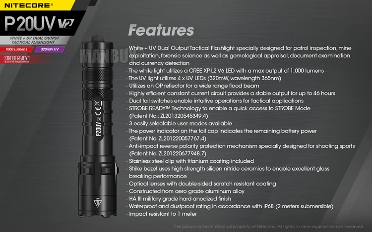 ВNitecore P20UV V2Интенсивно Мощный тактический светодиодный фонарик, который обеспечивает не только мощное белое освещение, но и мощный ультрафиолетовый луч. Достигая до 1000 люменов и расстояния луча более 160 метров, этот фонарик хорошо входит в число лучших и ярких тактических фонарей на рынке. Его320 мВтРежим ультрафиолета-это не что иное, как пожать плечами, способное раскрывать попрасные материалы на одежде, валютах и документах. Веб-дизайн от manbuy. В сочетании с отражателем оранжевой кожуры, который помогает излучать широкий и затопленный луч, P20UV V2 может гарантировать, что ничто не ускользнет от ваших прицелов.