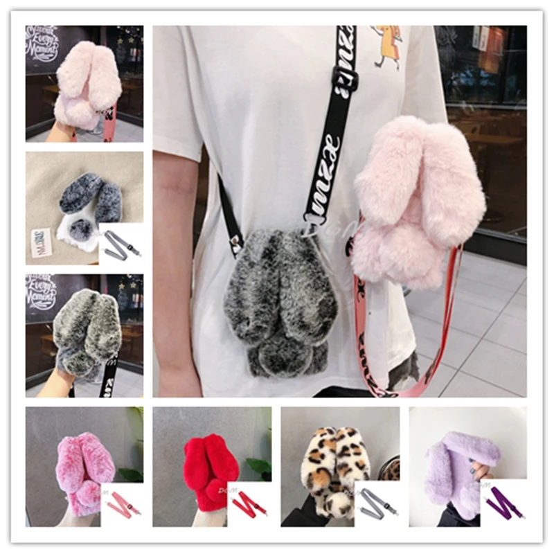 Чехол с регулируемым ремешком на шею для LG K42, K52, K62, K22, K41S, K51S, K61, K71, K40S, K50S, K40, Пушистый Плюшевый чехол с кроличьим мехом